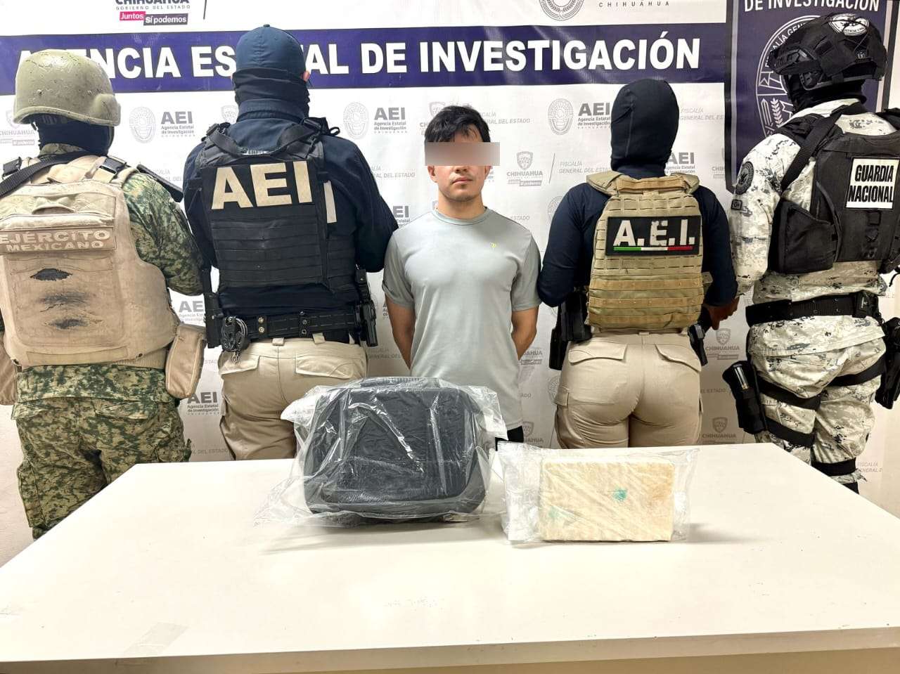 Ciudad Juárez.- Elementos de la Agencia Estatal de Investigación, adscritos a la Fiscalía de Distrito Zona Norte, del Ejército Mexicano y la Guardia Nacional, detuvieron en Ciudad Juárez a un sujeto que se identificó como Luis Carlos O. M., por delitos contra la salud, ya que se le aseguró poco más de un kilogramo de cocaína en piedra.