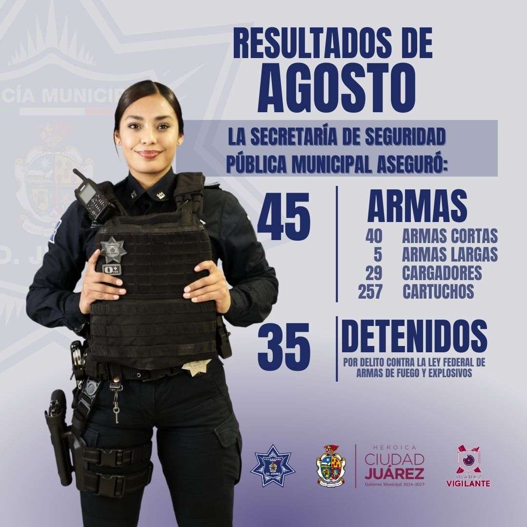 Ciudad Juárez .-La Secretaría de Seguridad Pública Municipal informa que, durante el mes de agosto del presente año, se aseguraron 45 armas de fuego de diversos calibres, al realizar diferentes intervenciones y operativos especiales.
