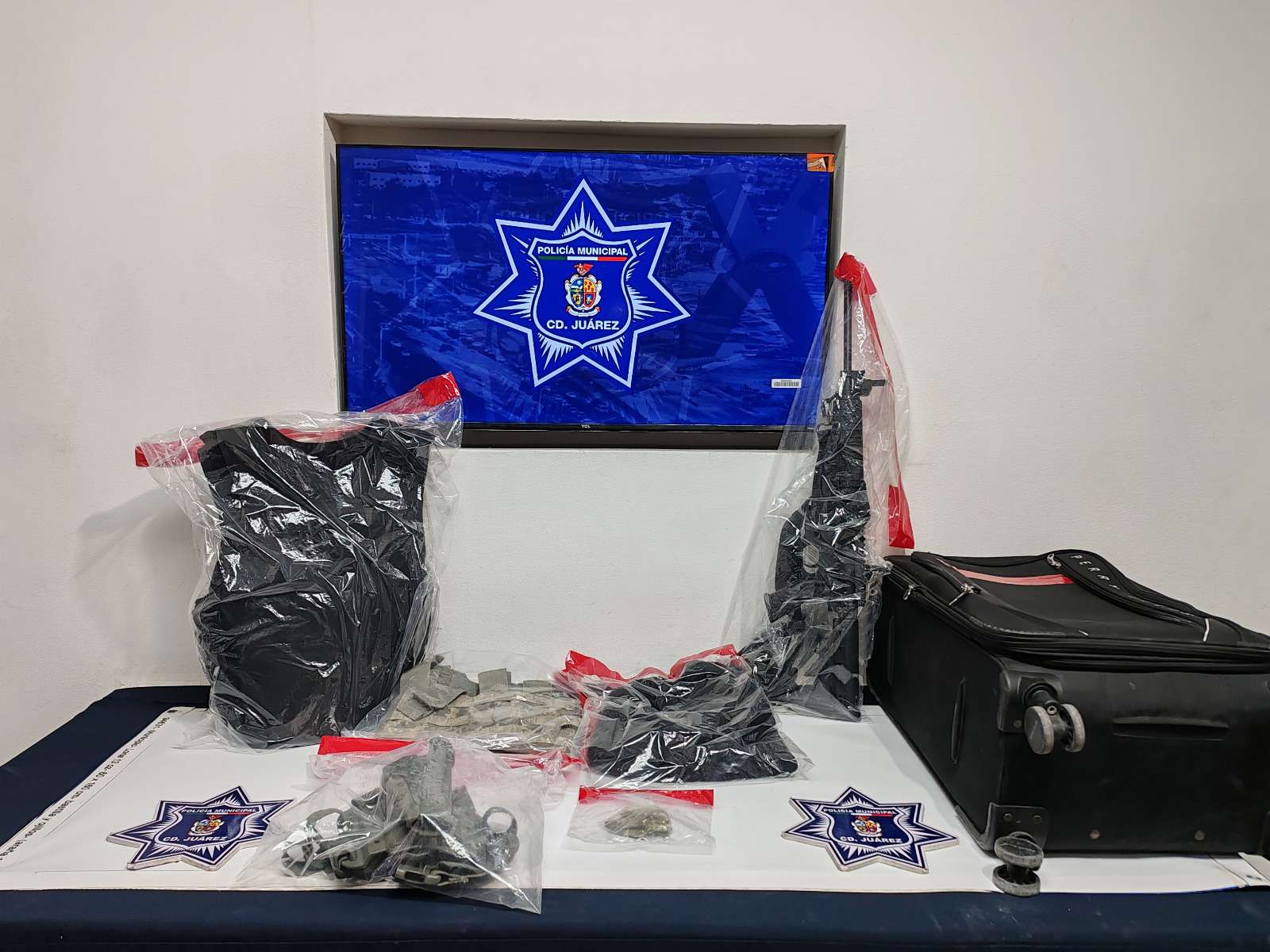 Durante la revisión, localizaron en el interior del automotor una maleta de color negro, de la cual sobresalía lo que aparentaba ser la punta de un arma larga, por lo que al inspeccionar el maletín, confirmaron que contenía un fusil de asalto calibre .223, con un cargador desabastecido, una bolsa de plástico con 13 cartuchos útiles del mismo calibre, un chaleco balístico en color negro, una funda para arma corta, un pasamontañas en color negro, así como un aditamento para chaleco porta cargadores.