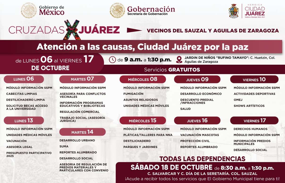 Ciudad Juárez.- Este sábado 18 de octubre se llevará a cabo el programa “Cruzadas por Juárez, Atención a las Causas, Ciudad Juárez por la Paz”, en la colonia El Sauzal, en la calle Salvarcar y Día de la Secretaría, de 8:30 de la mañana a 1:30 de la tarde.