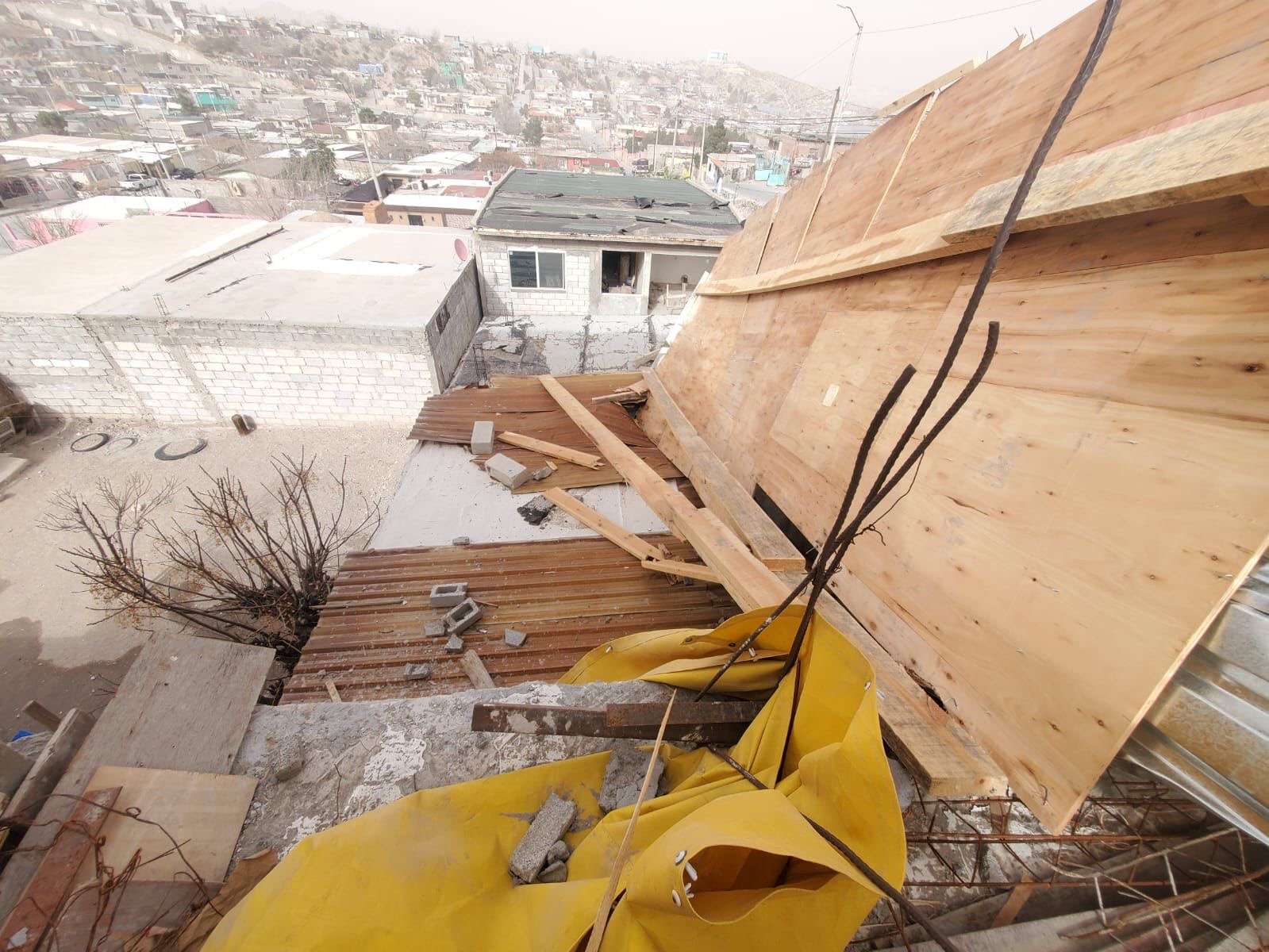 Ciudad Juárez.- La Dirección General de Protección Civil informó que, derivado de los fuertes vientos que se registran actualmente en la ciudad, se atendió el derrumbe de un techo proveniente del segundo piso de un domicilio en la colonia Puerto La Paz.