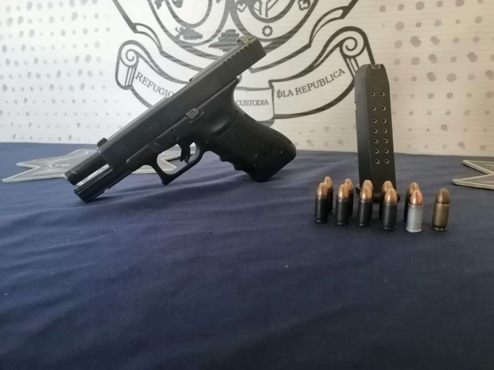 Motivo por el cual los oficiales le marcaron el alto al conductor por protocolos de seguridad y al realizarles una inspección les fue localizada en el interior del vehículo un arma de fuego calibre 9 milímetros con un cargador abastecido con 11 cartuchos útiles, por lo que de inmediato se procedió a su formal detención.