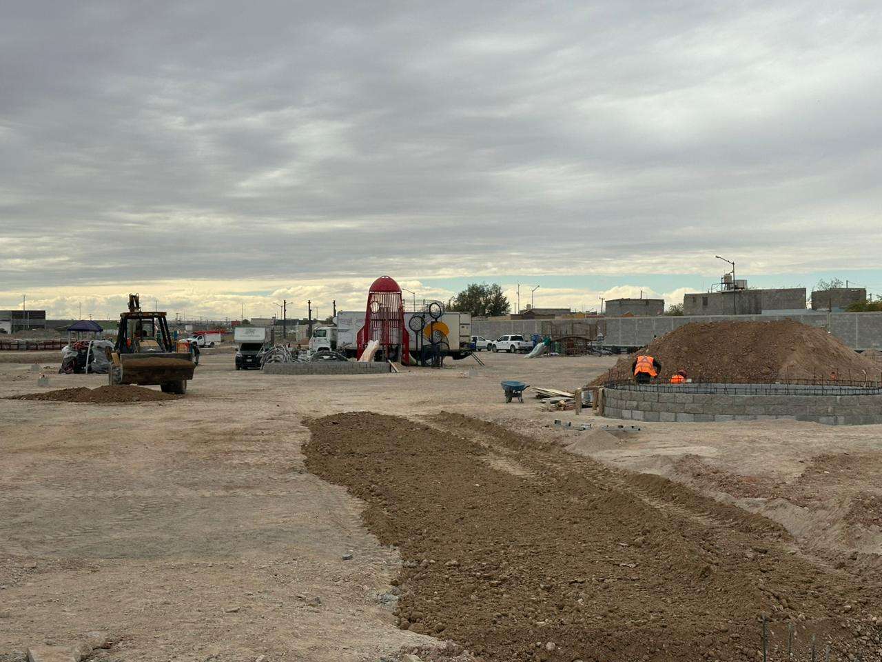 Ciudad Juárez.- La Dirección General de Obras Públicas continúa trabajando en la construcción del Parque Urbano Suroriente ubicado en la avenida Miguel de la Madrid y la calle Ramón Rayón, trabajando actualmente en la colocación de juegos, pero ya se lleva un avance del 65 por ciento en la obra.