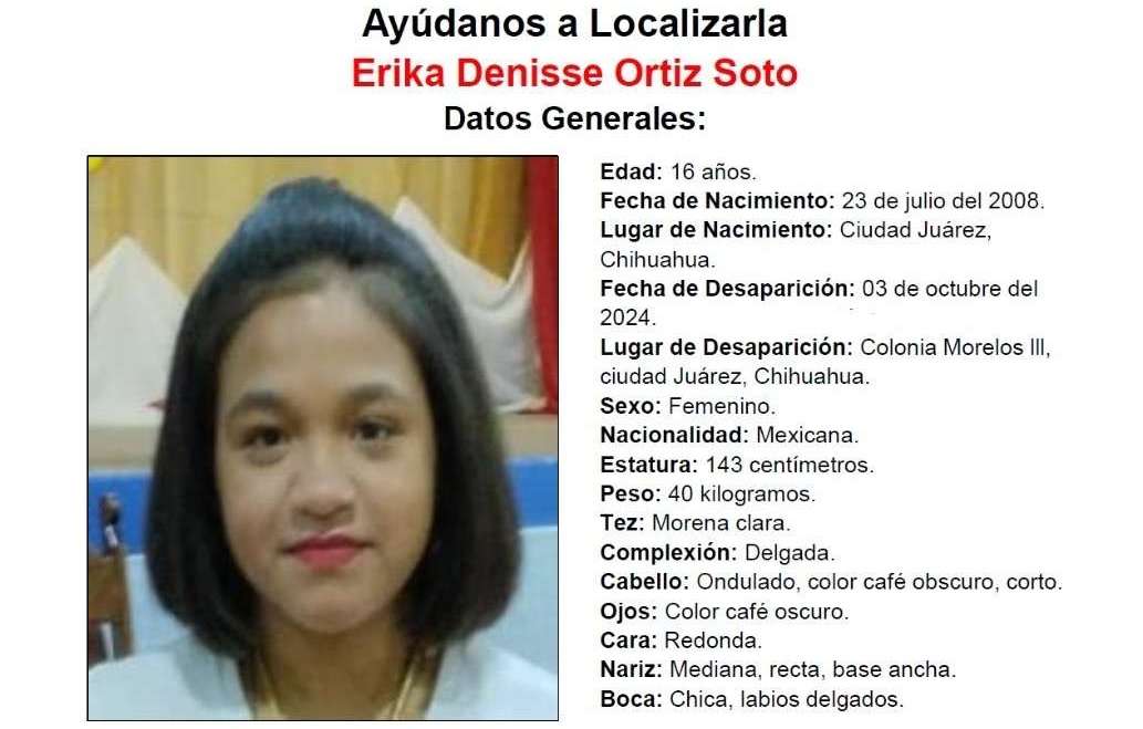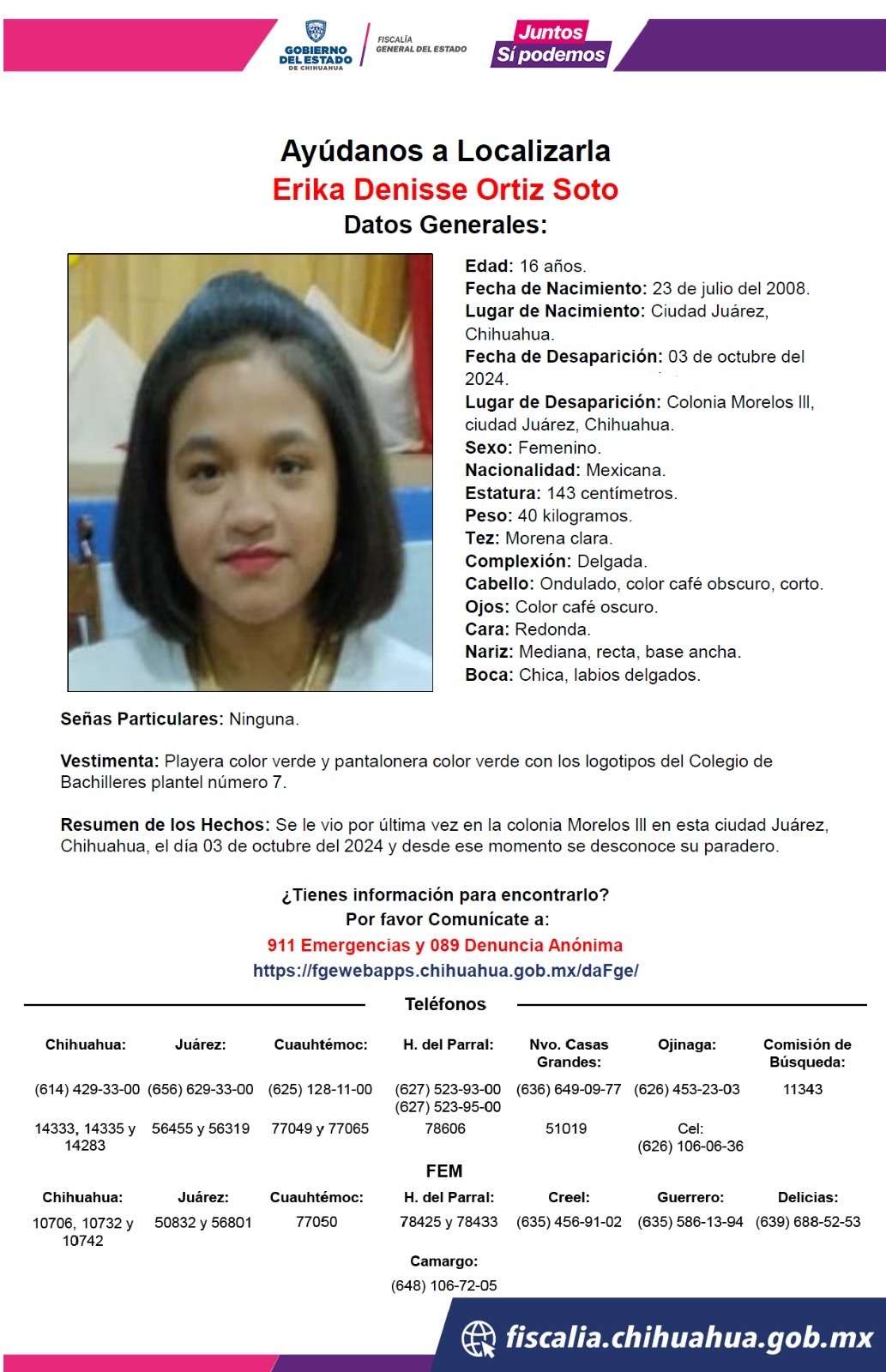 Ciudad Juárez.- Agentes de la Secretaría de Seguridad Pública Municipal realizaron un recorrido en la colonia Manuel Gómez Morín, en donde procedieron a la colocación de varias pesquisas con el fin de localizar a Erika Denisse Ortiz Soto, adolescente de 16 años de edad.