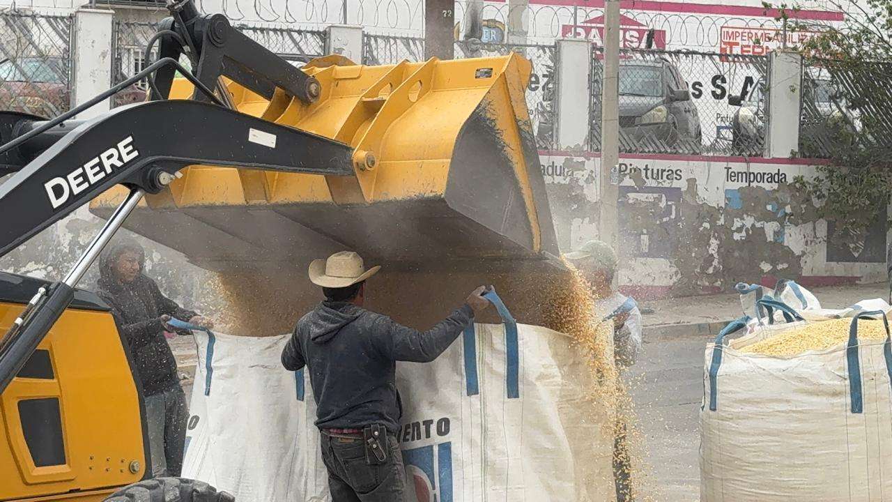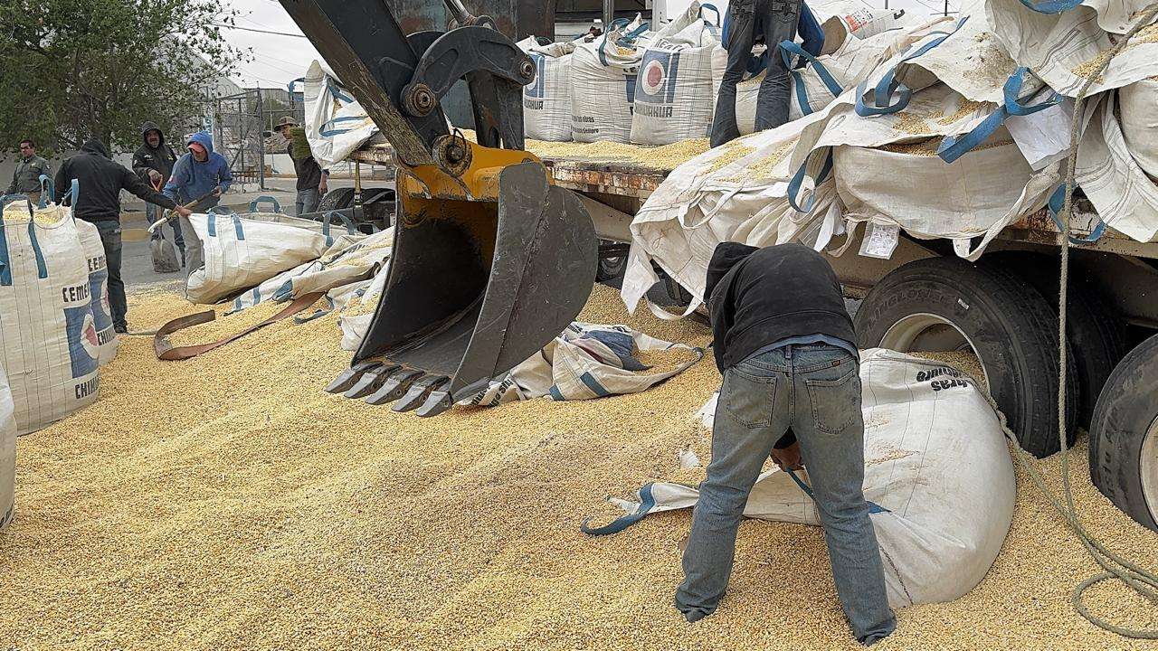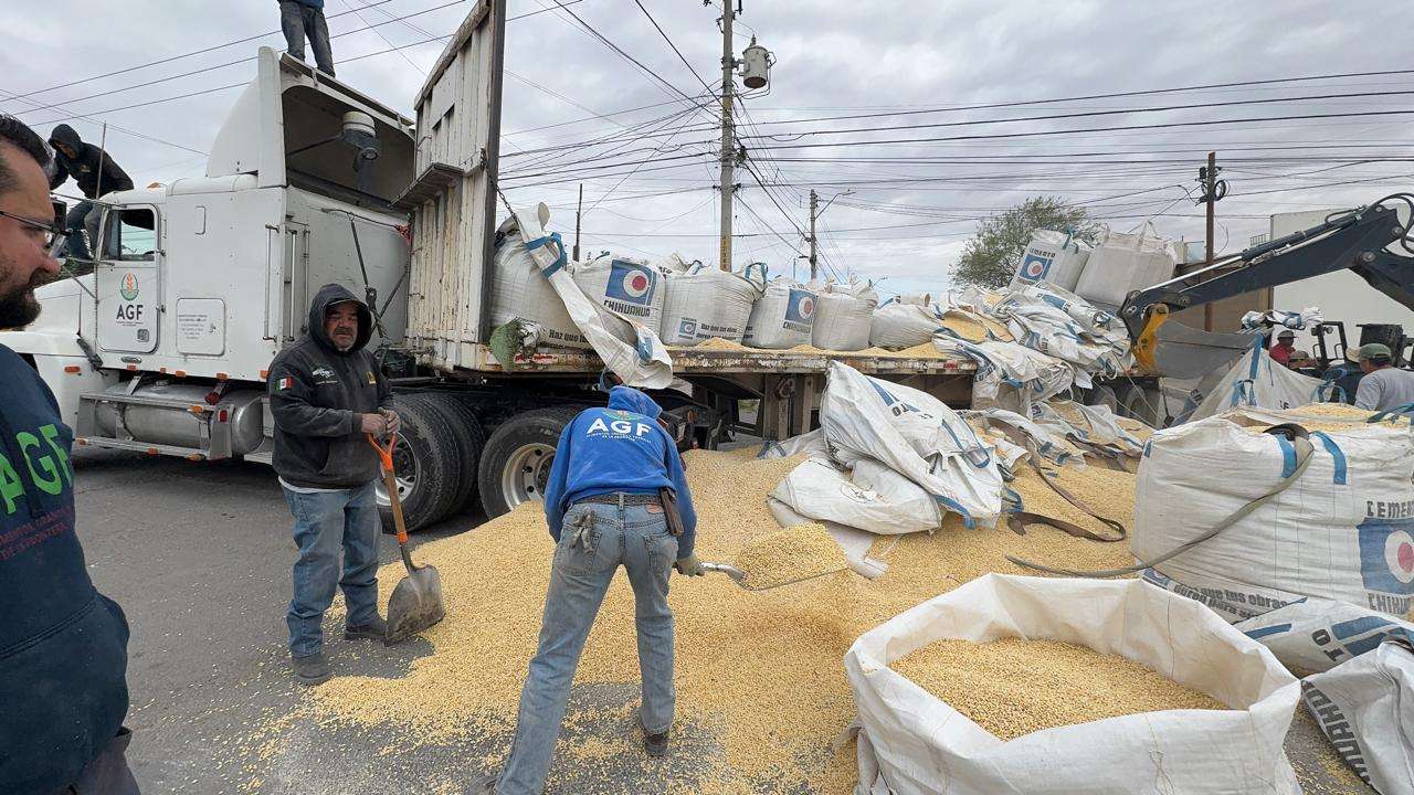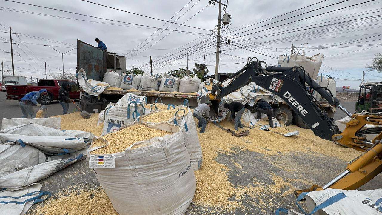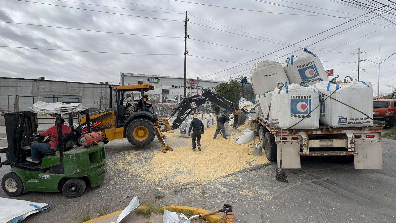El Tráiler traia 100 costales de maíz y circulaba por la calle Sierra de las Vírgenes y al dar vuelta a la derecha en la Cesáreo Santos perdió el control y se le cayeron unos 50 costales.
