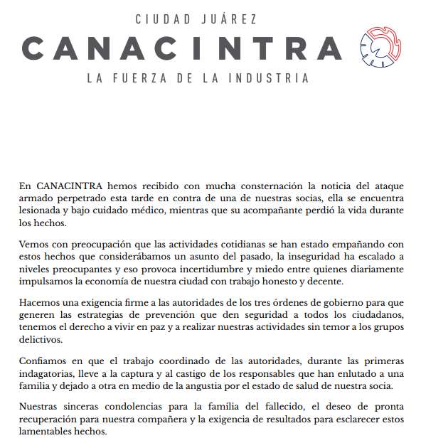 Ciudad Juárez.- La Cámara Nacional de la Industria de Transformación (CANACINTRA) expresó su preocupación tras el ataque armado sufrido por una de sus socias, Claudia García, quien se encuentra en estado grave, mientras que su acompañante perdió la vida en el incidente. En un comunicado oficial, CANACINTRA hace un llamado urgente a las autoridades para tomar medidas: