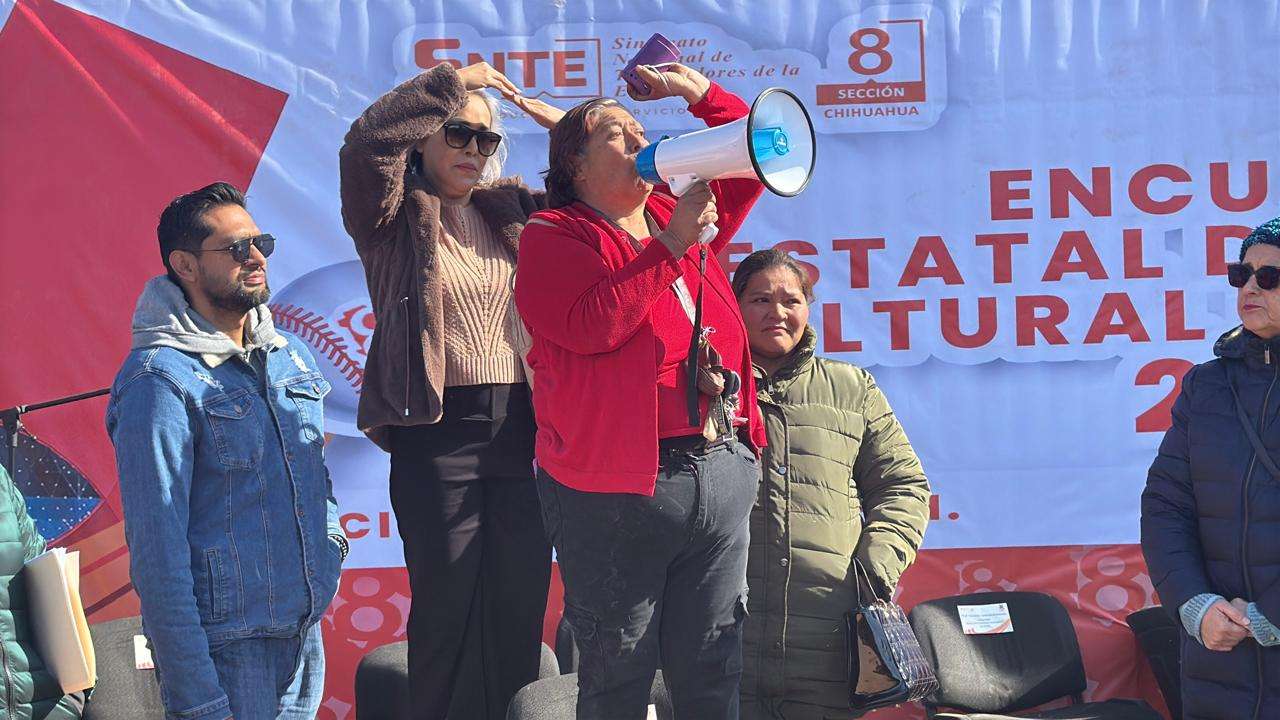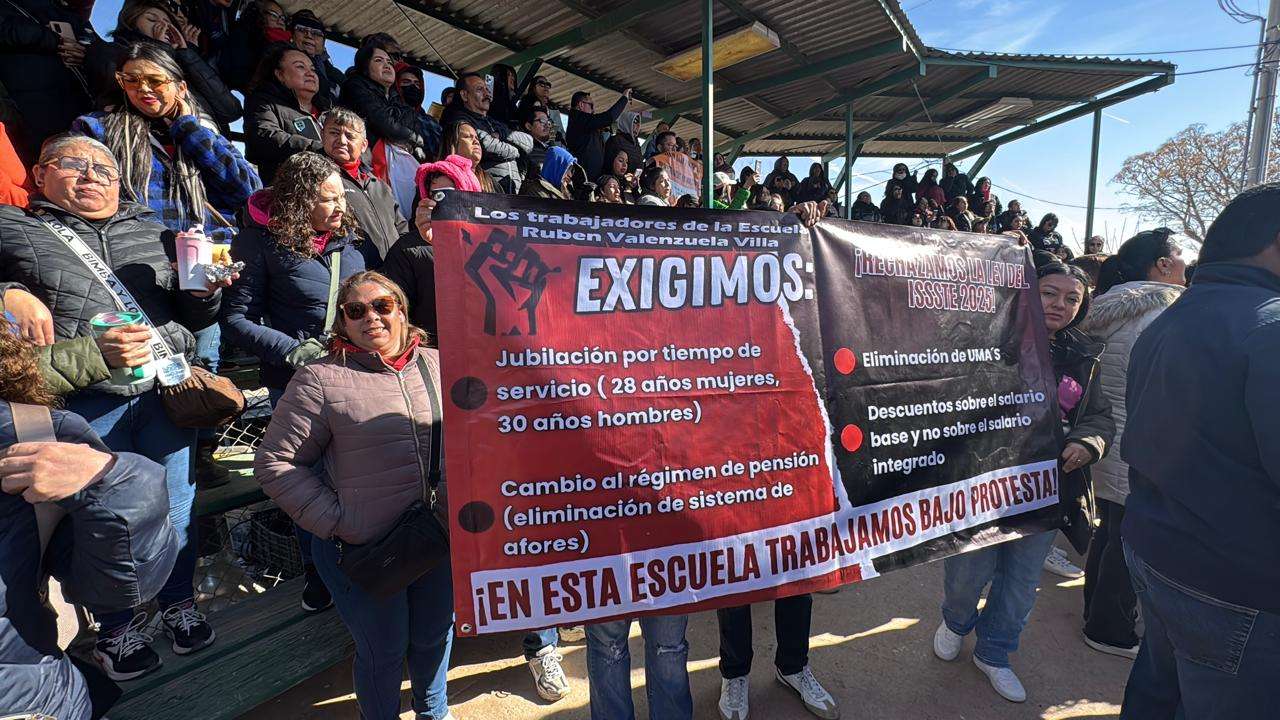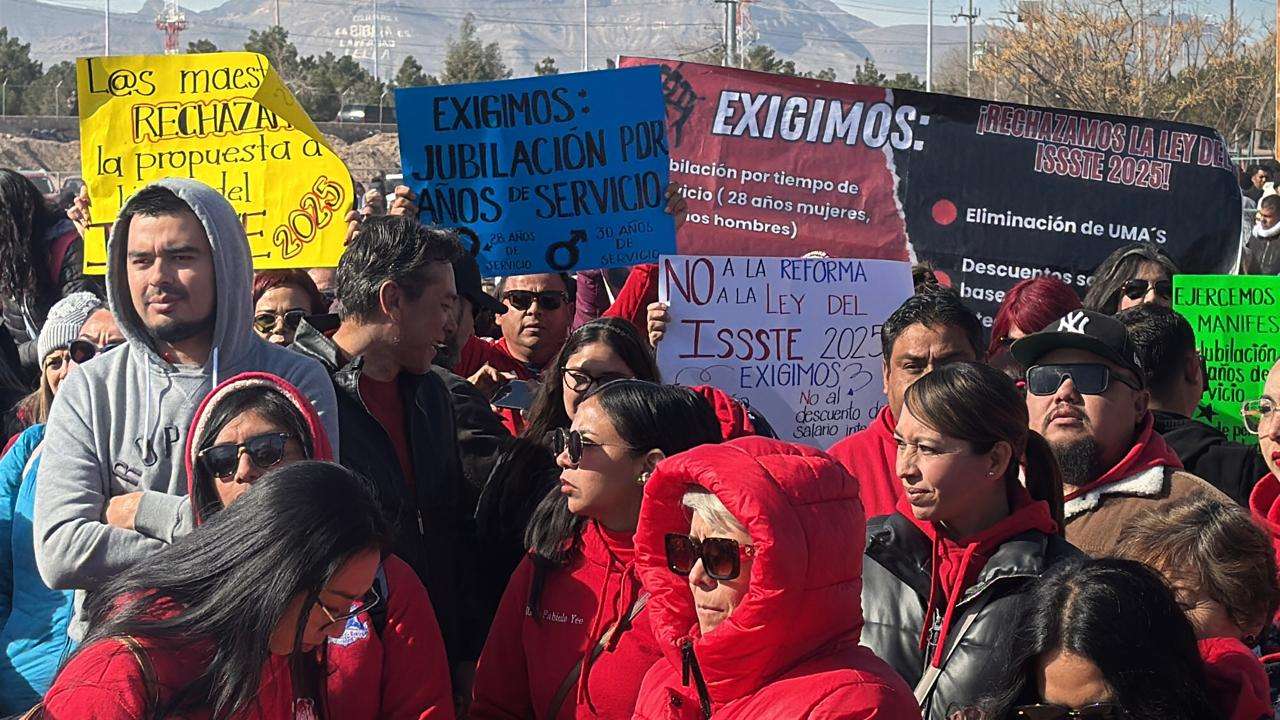 Ciudad Juárez, Chih.- Cientos de maestras y maestros se reunieron para protestar contra la reforma a la Ley del ISSSTE, a un lado de la Plaza de la Mexicanidad.