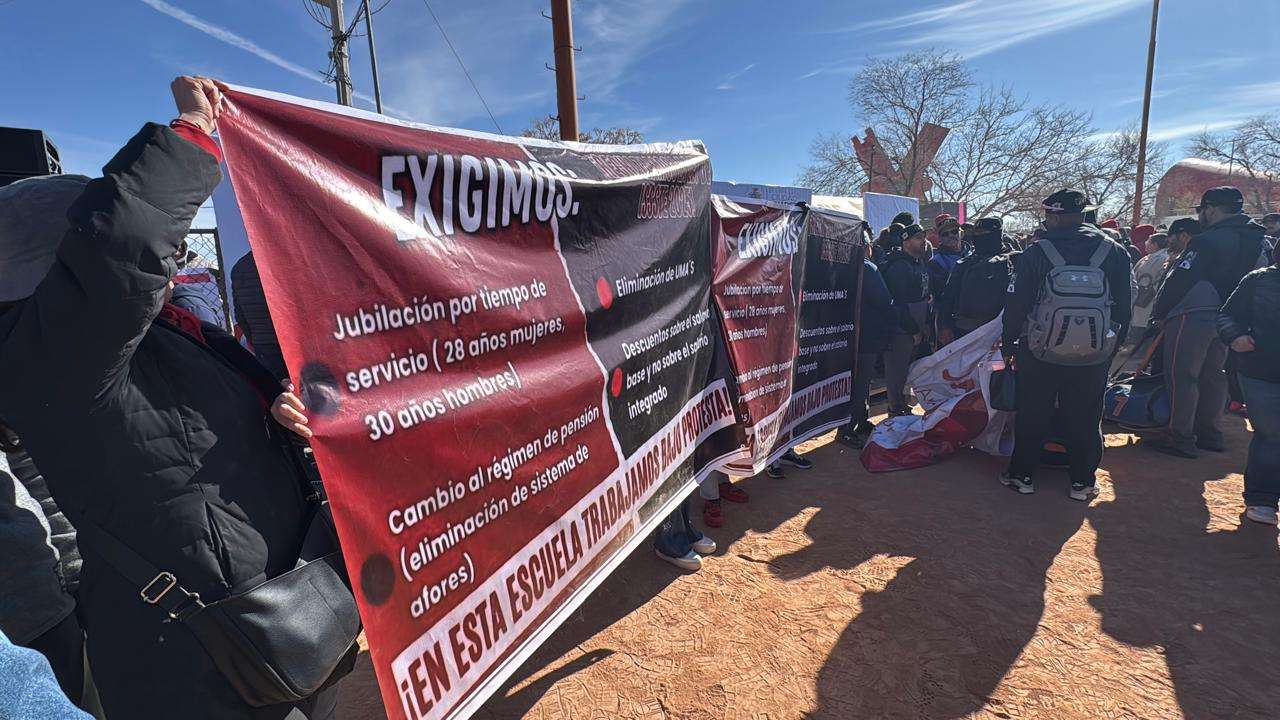 Durante la protesta, los maestros portaban pancartas con mensajes como “¡Por nuestros derechos, por nuestro futuro!”, “Trabajo bajo protesta” y “No más descuentos a nuestro sueldo”.