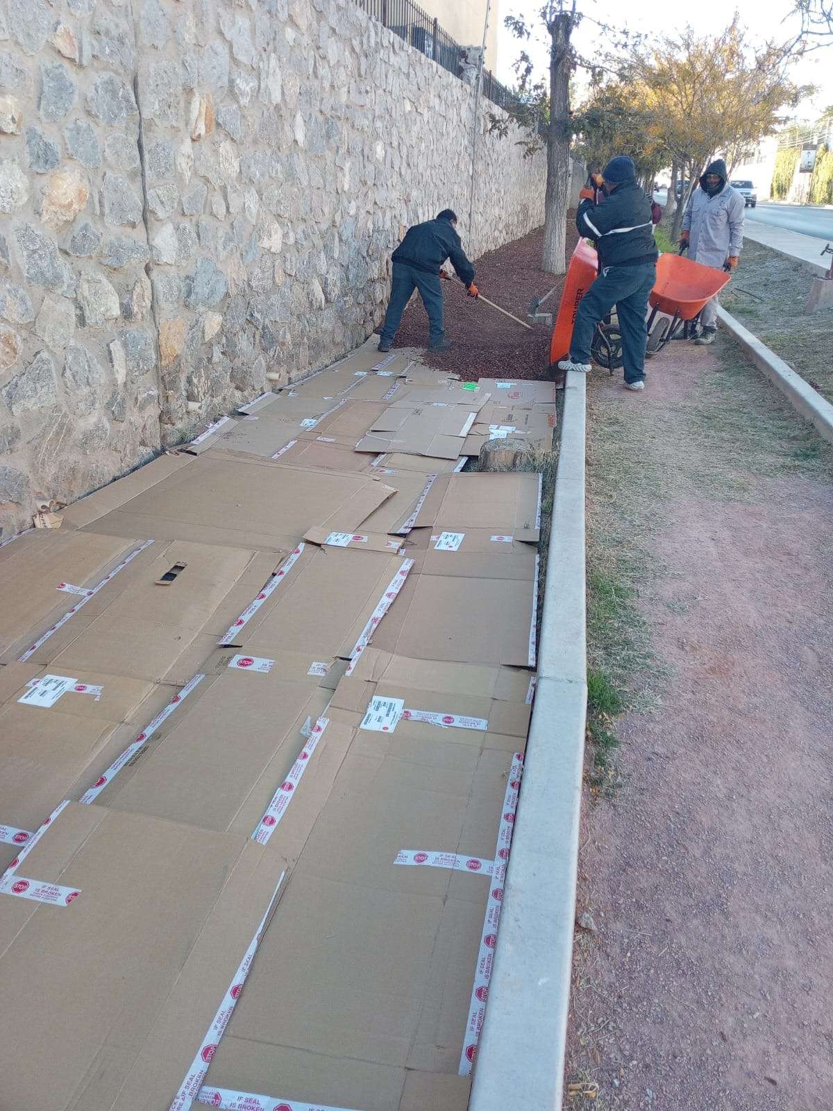 Ciudad Juárez.- Personal de la Dirección de Parques y Jardines atiende los andadores de la calle Camino a Escudero, en el tramo de la avenida Tomás Fernández a calle Canal.