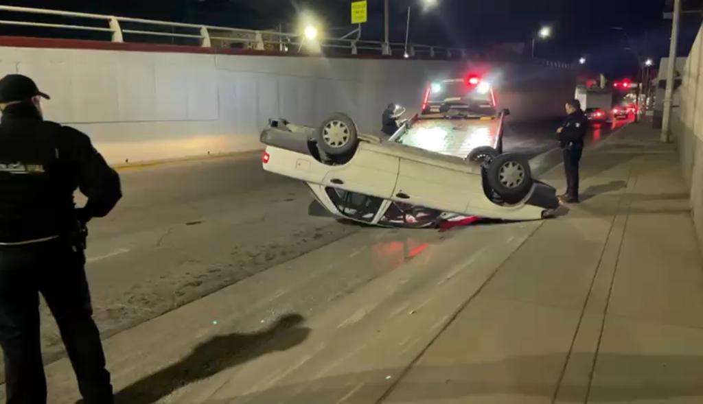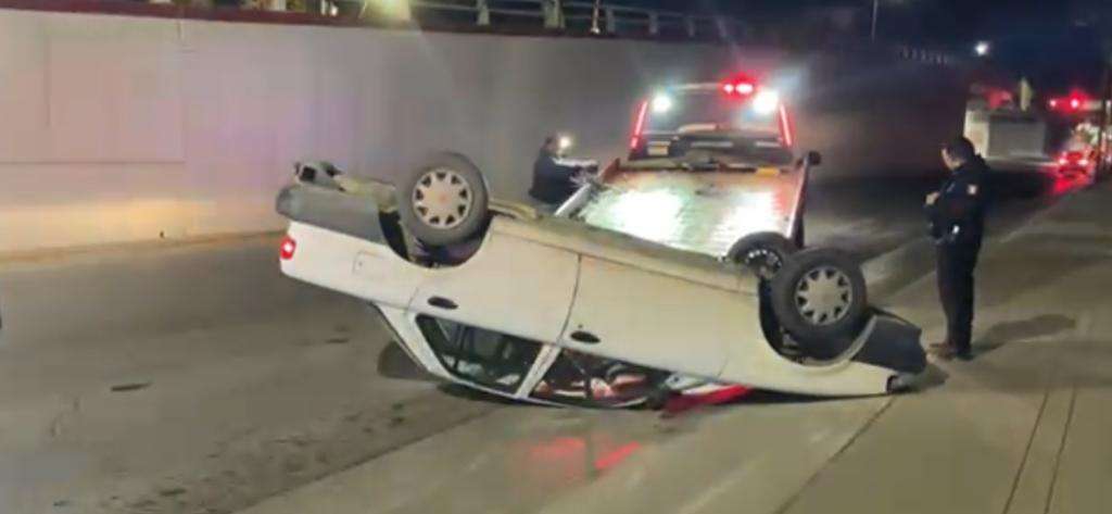 Ciudad Juárez.- Se registró una volcadura de un automóvil Nissan Tsuru en el cruce del bulevar Manuel Gómez Morin y avenida Tecnológico justamente a un costado del puente Rotario.