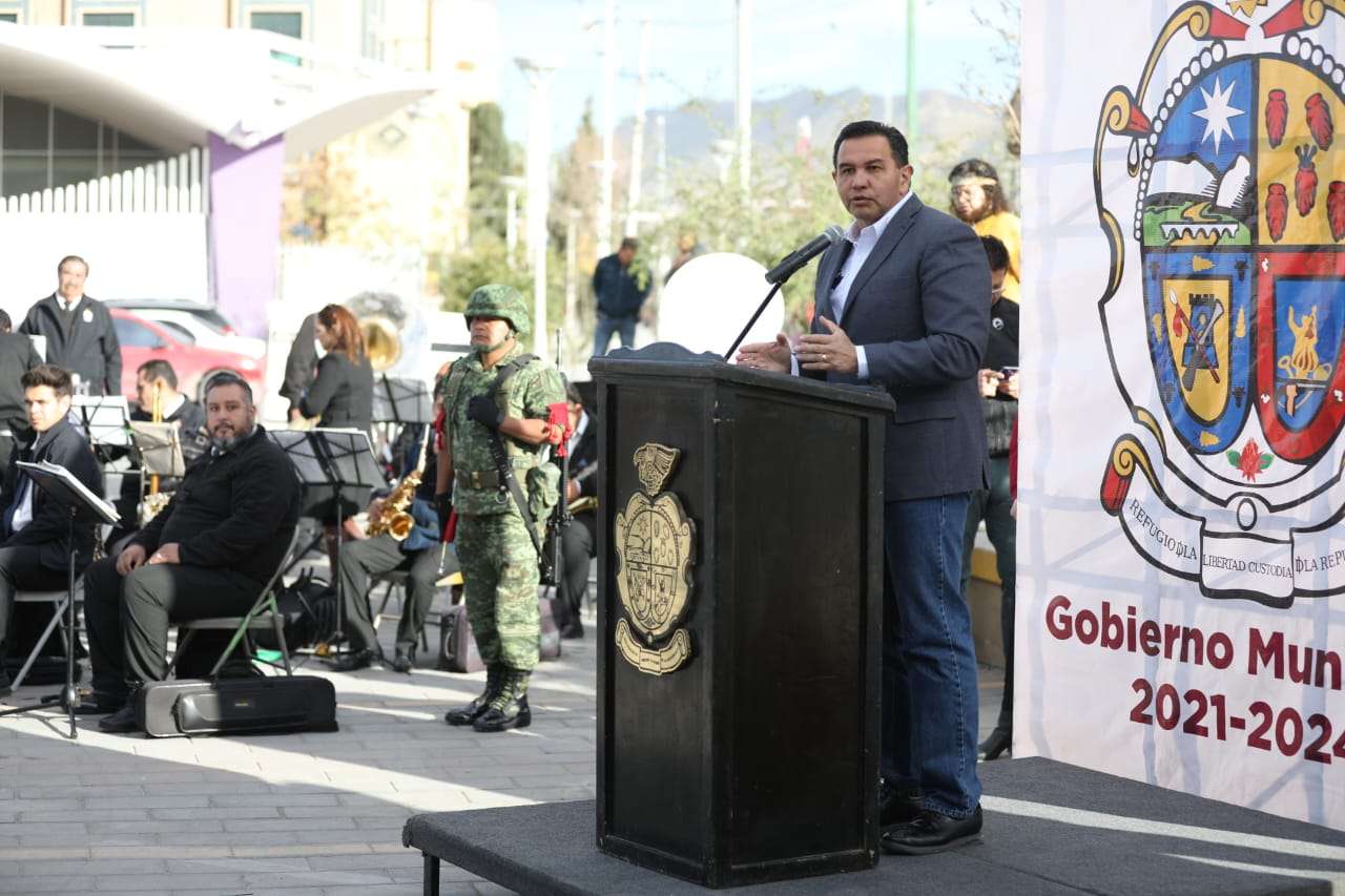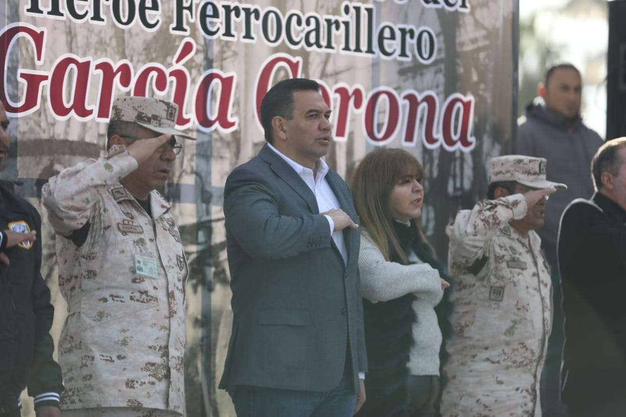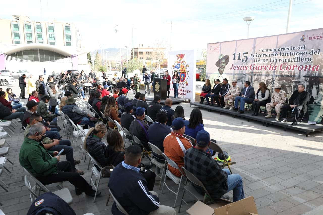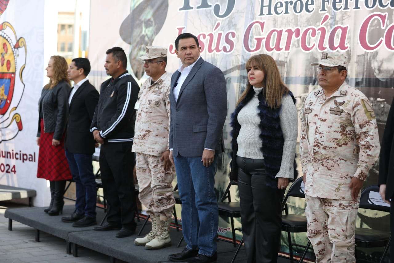 Ciudad Juárez.- El Presidente Municipal, Cruz Pérez Cuéllar, encabezó la ceremonia del 115 aniversario luctuoso del Héroe Ferrocarrilero, Jesús García Corona.