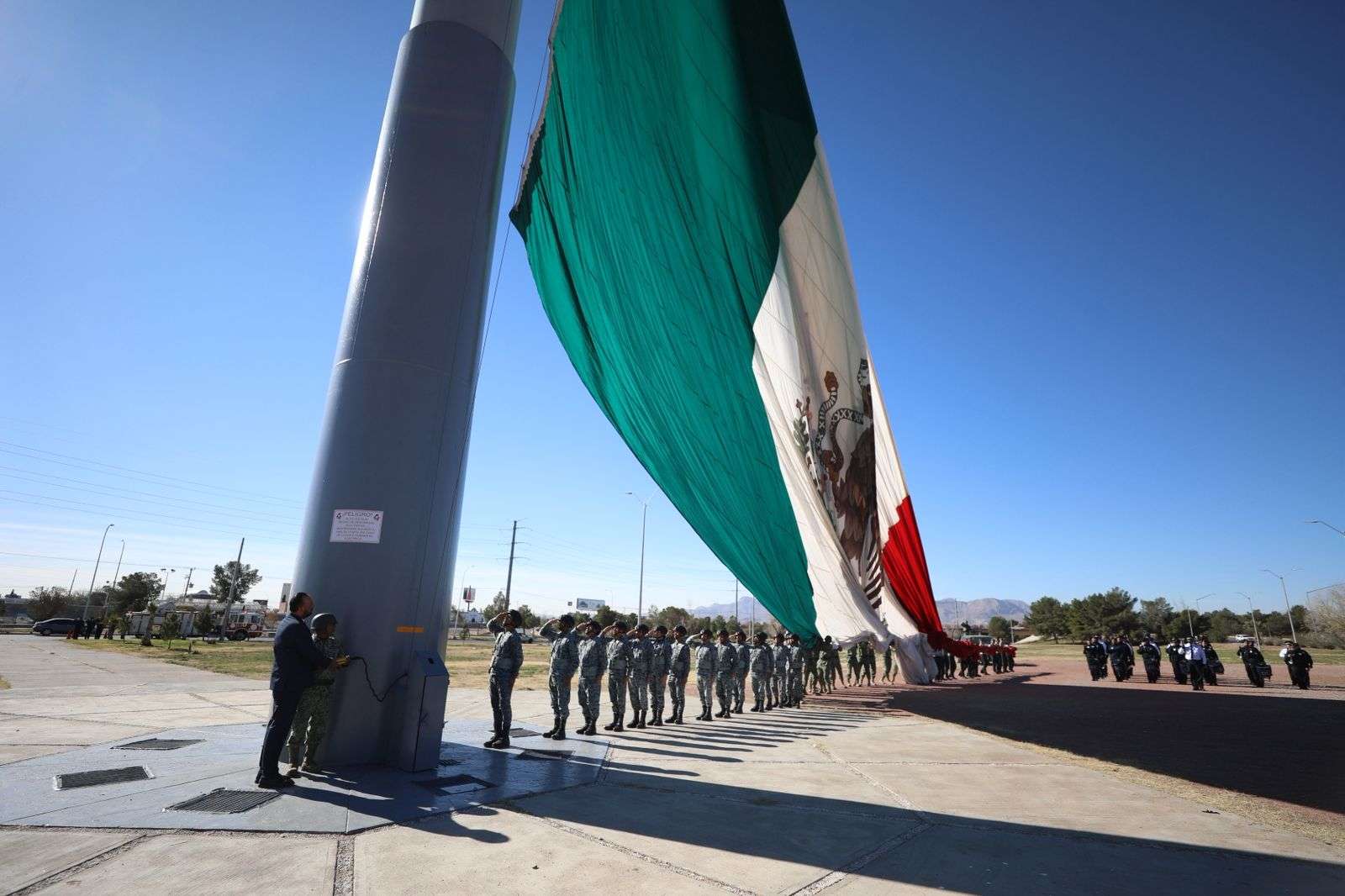 Ciudad Juárez.- En el marco del CIX Aniversario de la promulgación de la Constitución Política de los Estados Unidos Mexicanos y de la campaña Febrero, Mes del Ejército y Fuerza Aérea Mexicanos, el Gobierno Municipal llevó a cabo la Ceremonia de Izamiento de Bandera, como un acto cívico para fortalecer también los valores de legalidad, identidad nacional y reconocimiento a las Fuerzas Armadas.