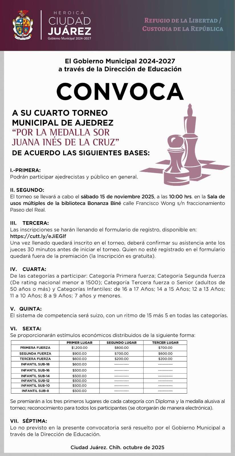Ciudad Juárez.- La Dirección de Educación Municipal convoca a la ciudadanía a participar en el 4to Torneo de Ajedrez Municipal 2025 “Por la medalla Sor Juana Inés de la Cruz”.