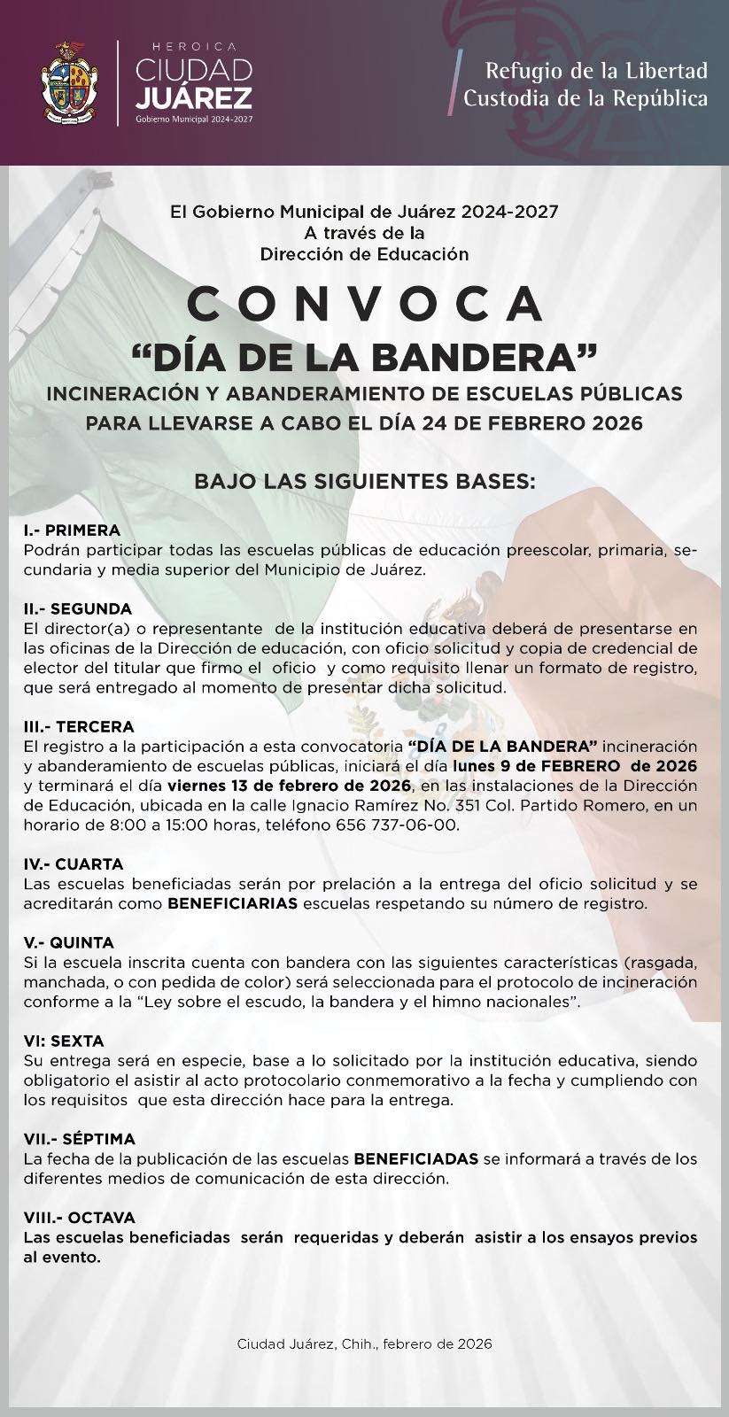 Ciudad Juárez.- El Gobierno Municipal de Juárez, a través de la Dirección de Educación, emitió la convocatoria para la incineración y abanderamiento de escuelas públicas en el marco de la conmemoración del Día de la Bandera, actividad que se llevará a cabo el 24 de febrero de 2026.