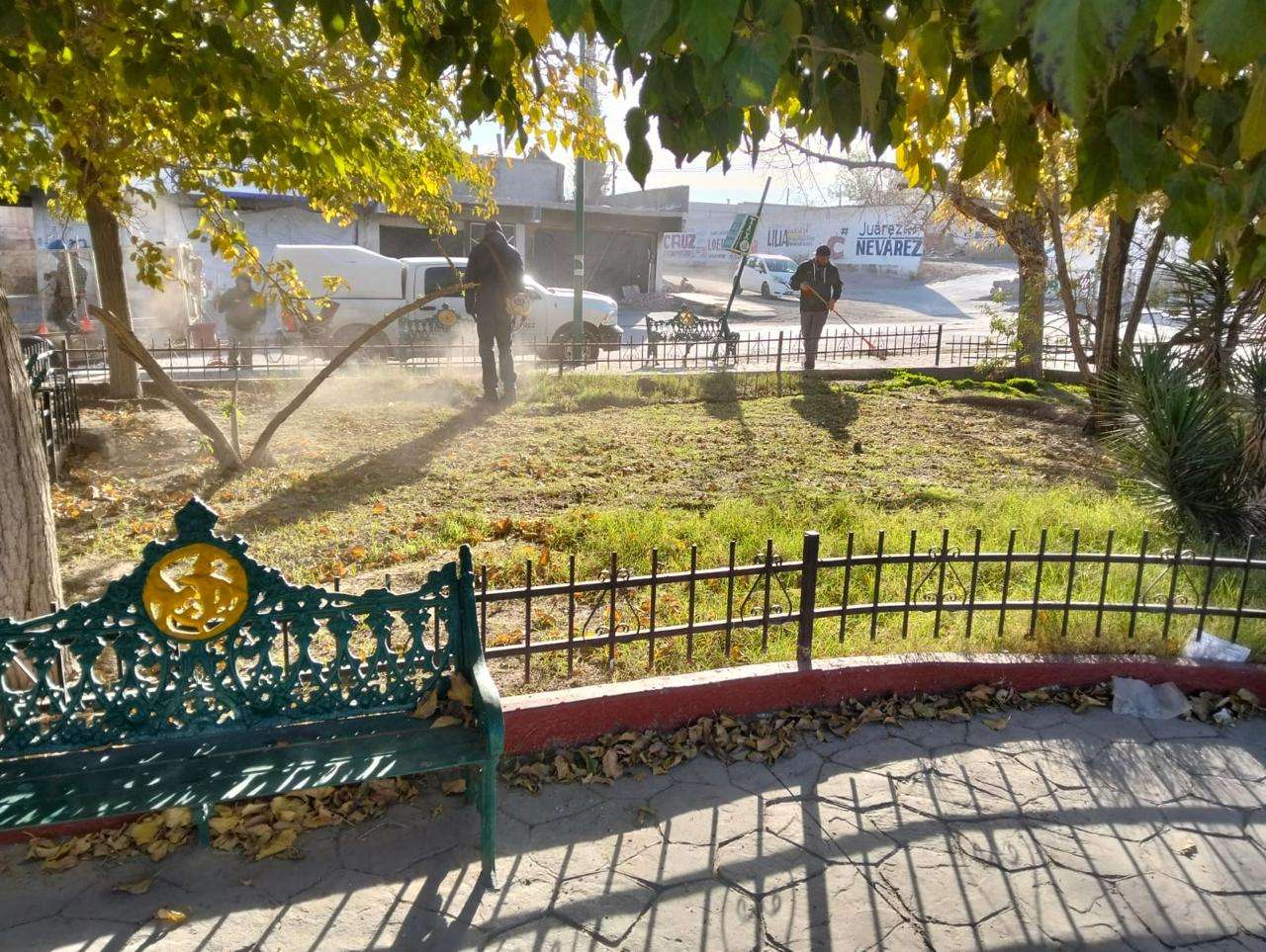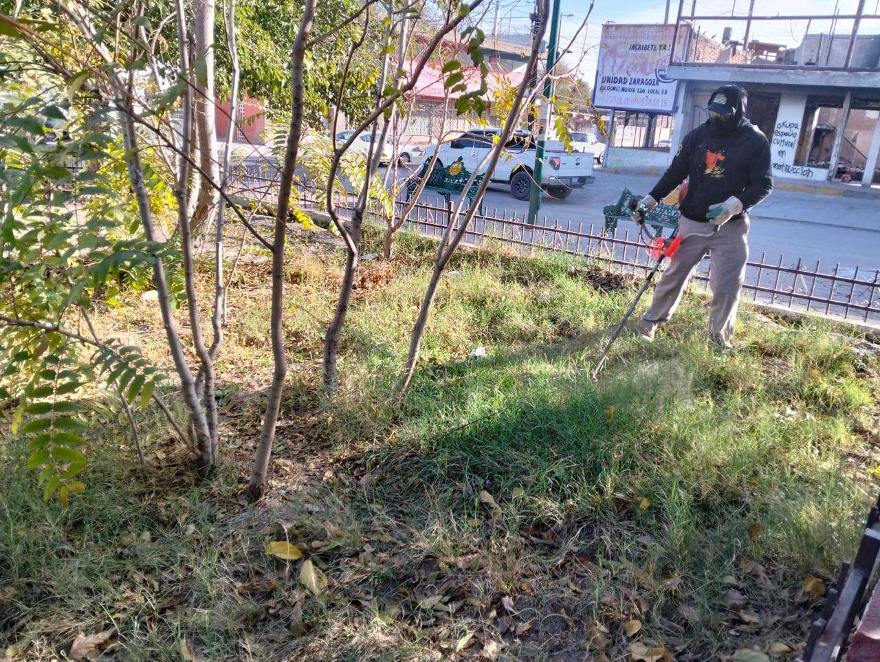 Ciudad Juárez.- La Dirección General de Servicios Públicos Municipales, a través de la Dirección de Parques y Jardines, realizó tareas de mantenimiento en la Plaza Zaragoza, localizada al sur de la ciudad.