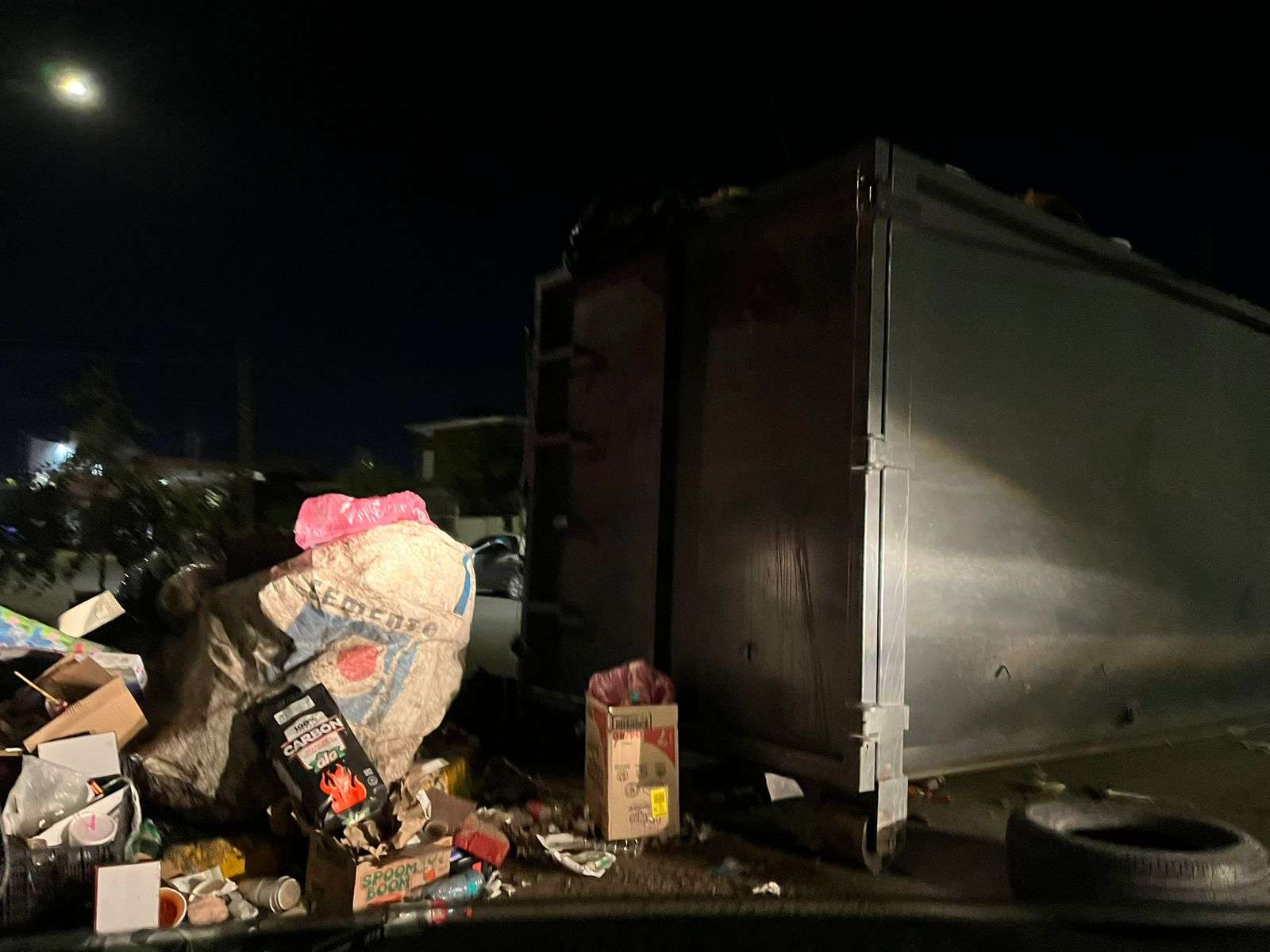 En un recorrido realizado por la zona, se observaron bolsas de desechos, restos de alimentos, envases plásticos y cartones apilados en banquetas y esquinas, además de charcos con residuos que generaban un olor desagradable.