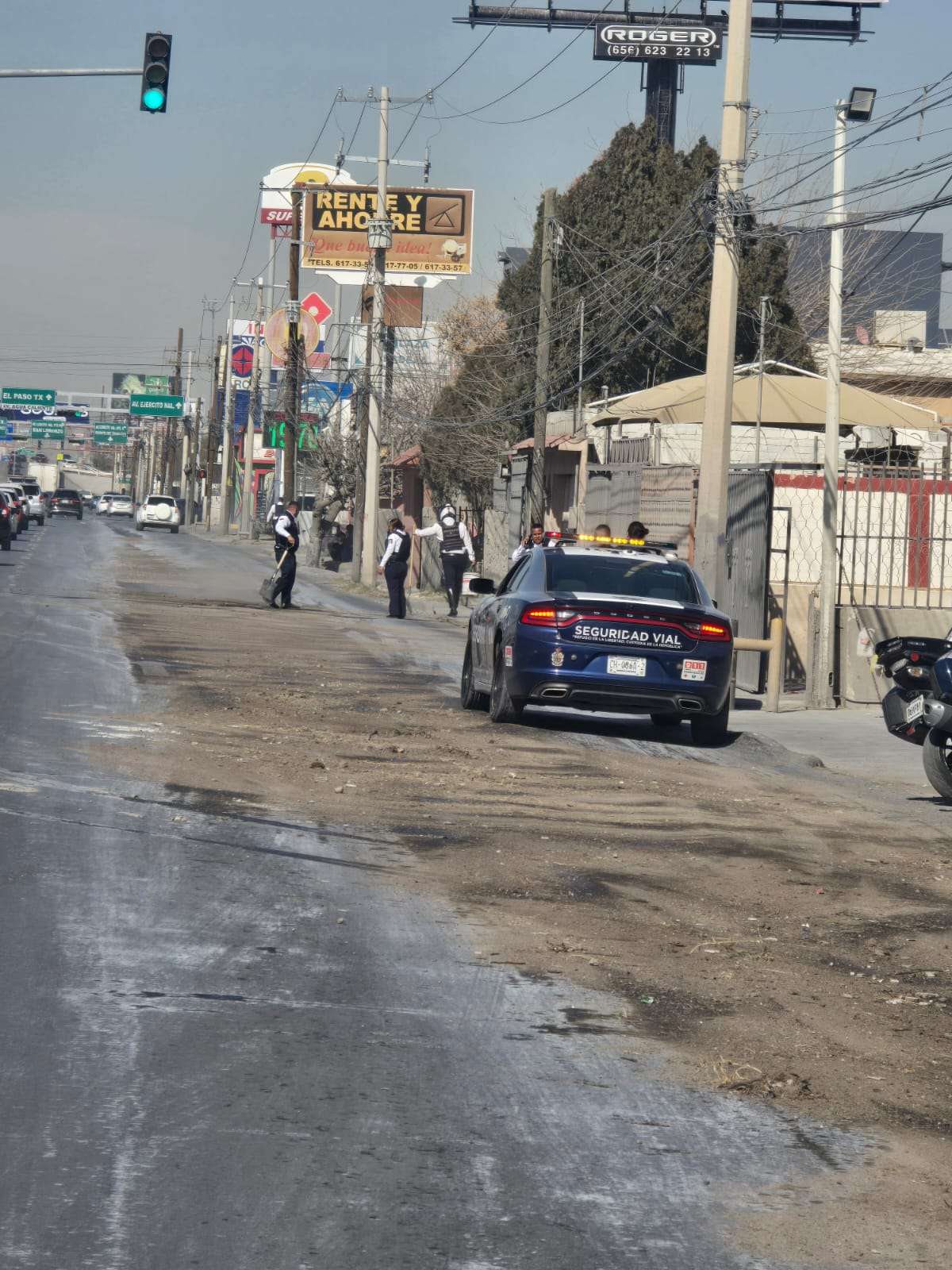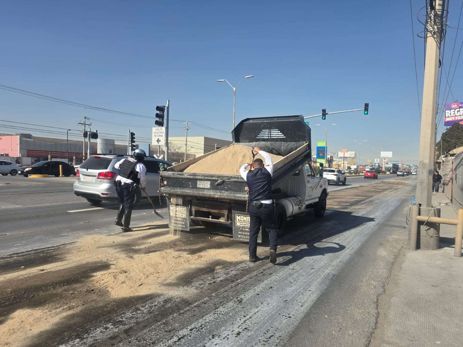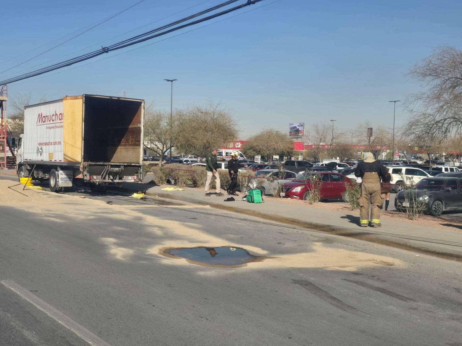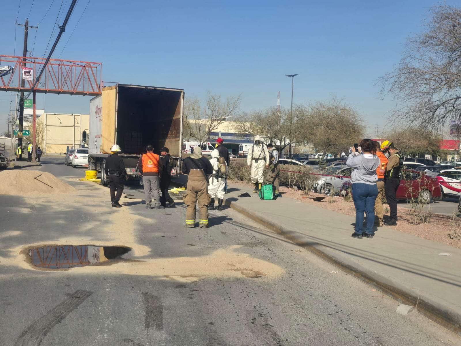 Ciudad Juárez.- Un camión derramó químicos en la avenida Tecnológico, lo cual provocó un choque y fuerte tráfico.