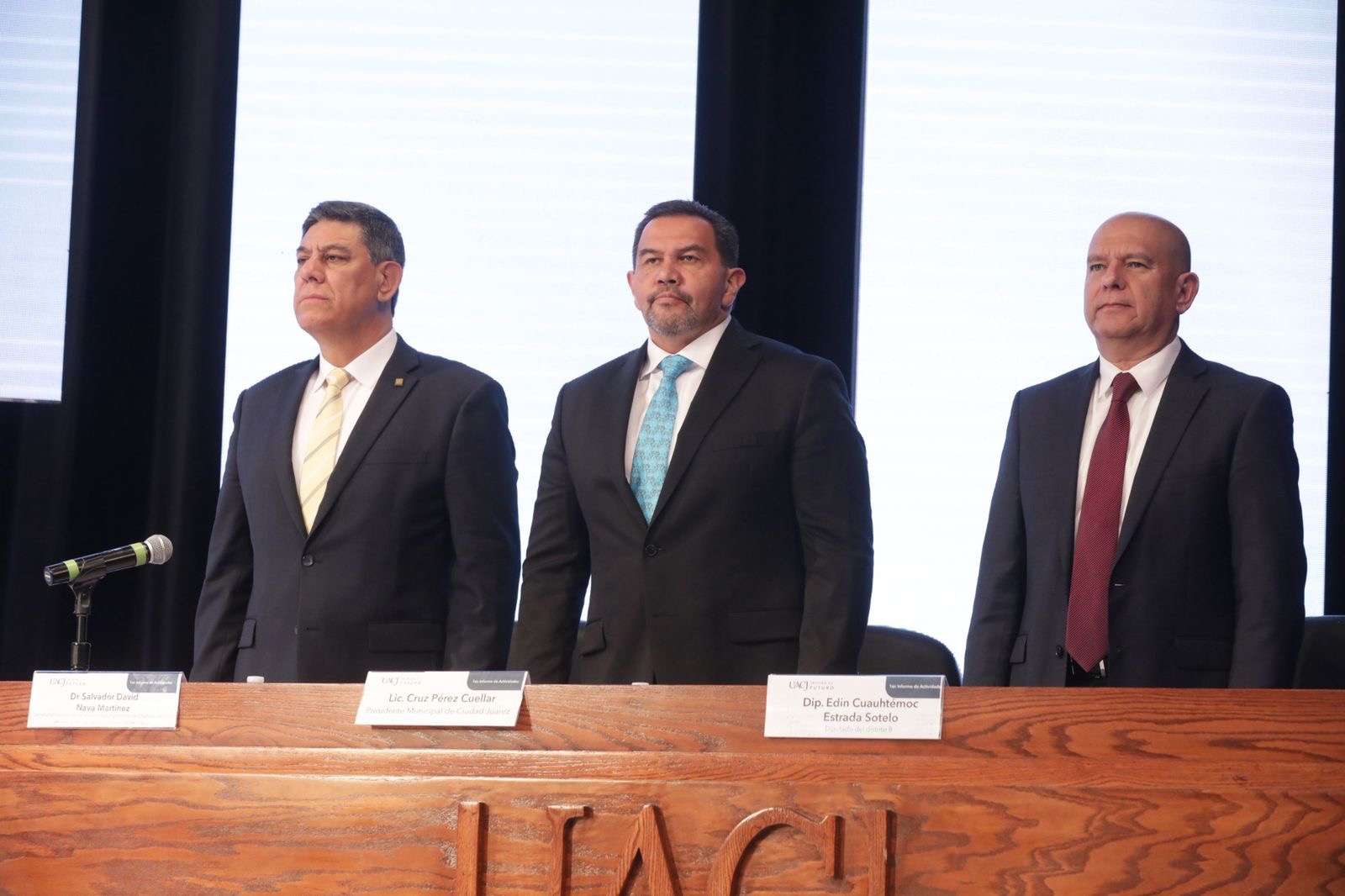 Ciudad Juárez.- En el marco del Primer Informe de Actividades del rector de la Universidad Autónoma de Ciudad Juárez, Daniel Alberto Constandse Cortez, el Presidente Municipal, Cruz Pérez Cuéllar refrendó su compromiso de ser un aliado de la máxima casa de estudios.