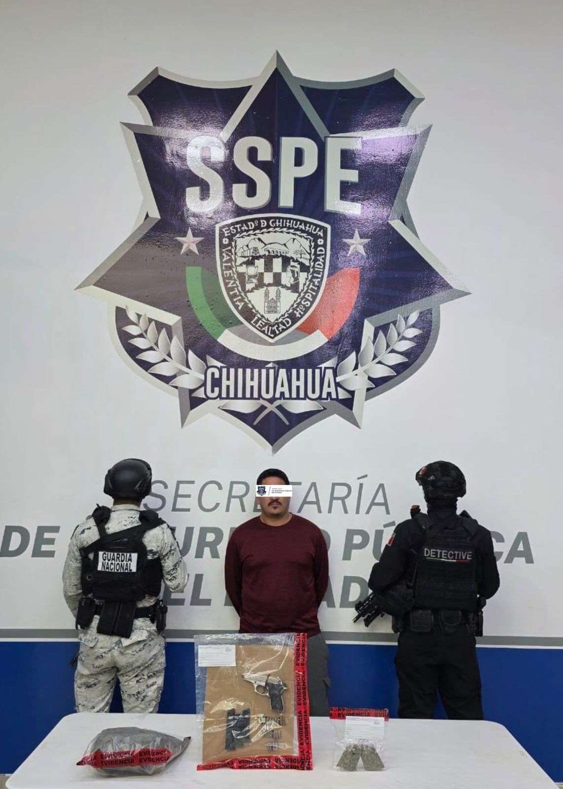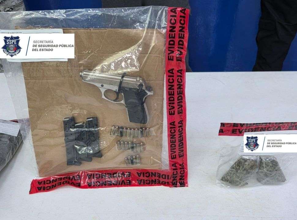 Asimismo, en labores de inteligencia realizadas durante el pasado sábado fue detenido Francisco Javier “N” a quien se le aseguraron dos armas de fuego y cuatro envoltorios de plástico con 33 gramos de hierba verde y seca con características propias de la marihuana.