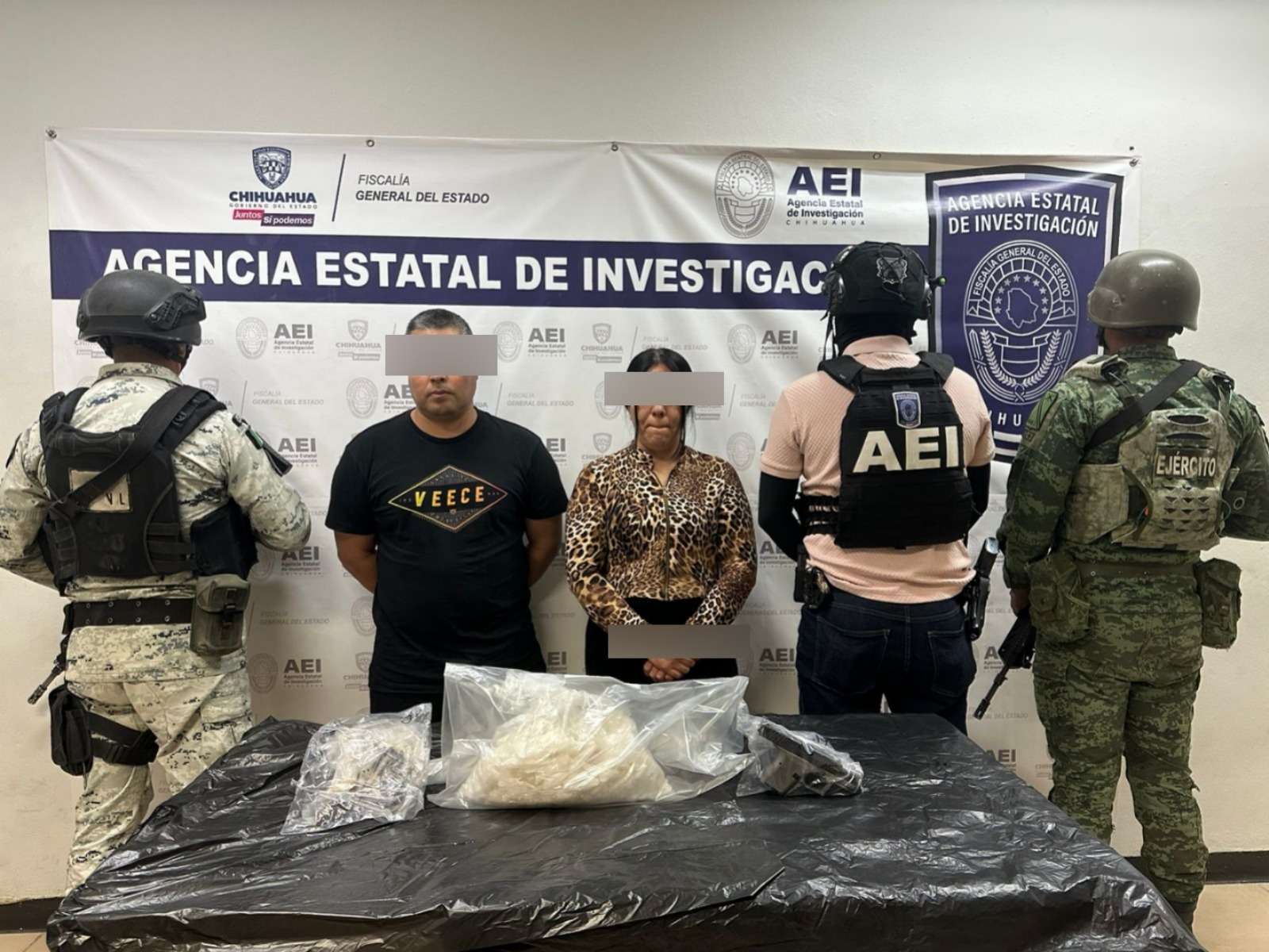 Ciudad Juárez.- Elementos de la Agencia Estatal de Investigación, adscritos a la Fiscalía de Distrito Zona Norte, detuvieron en los términos de la flagrancia, a Joel R. V., de 44 años, y Flor Azucena G. C., de 42 años de edad, por su presunta responsabilidad en los delitos de portación ilegal de arma de fuego y contra la salud, registrados en Ciudad Juárez.