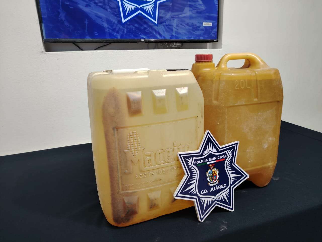 La intervención policial se derivó luego de que agentes municipales fueran alertados a través del sistema de videovigilancia “Juárez Vigilante” acerca de un hombre y una mujer sustrayendo combustible de una maquinaria perteneciente a una empresa constructora ubicada en la colonia Ejido Senecú.