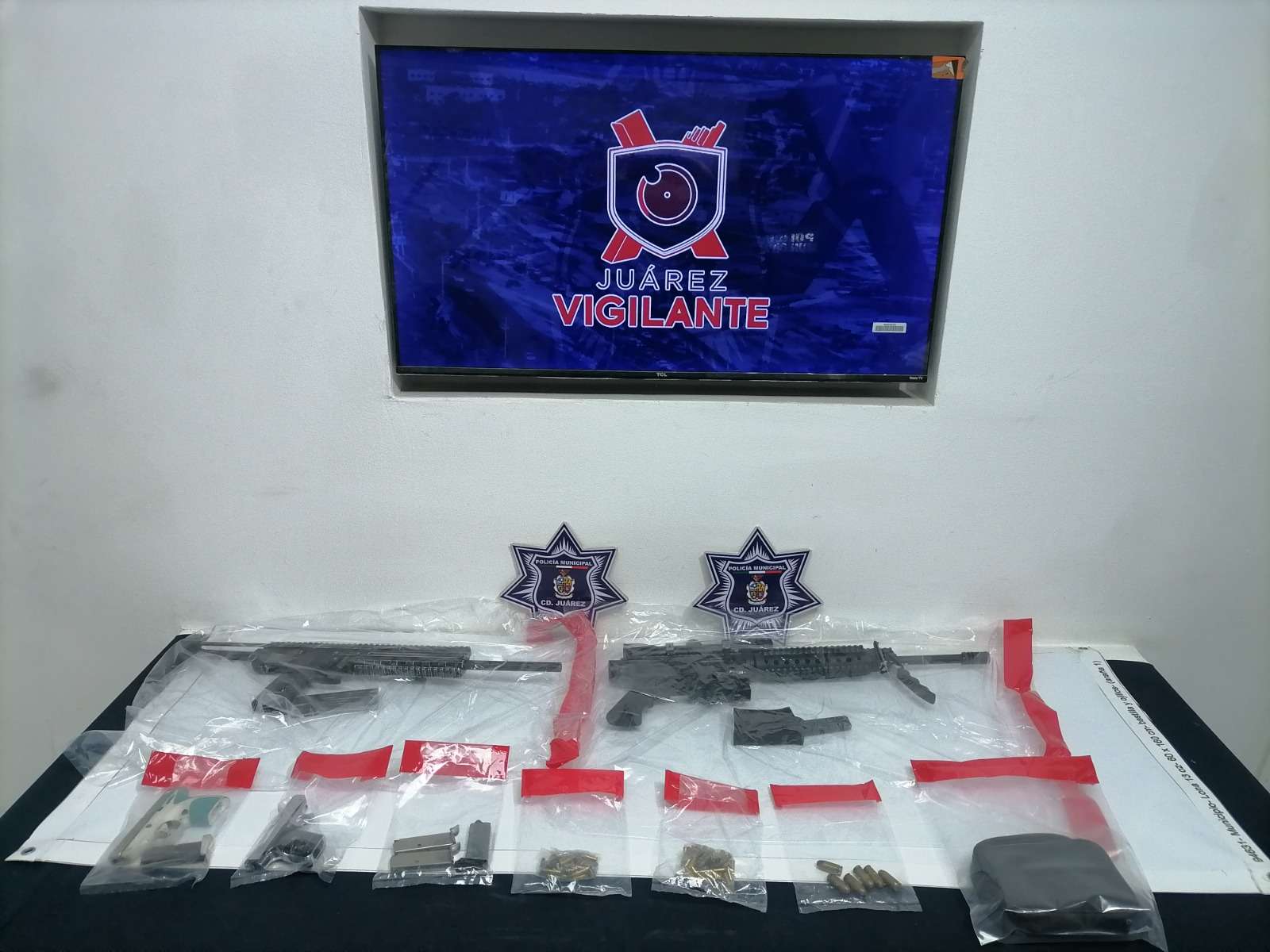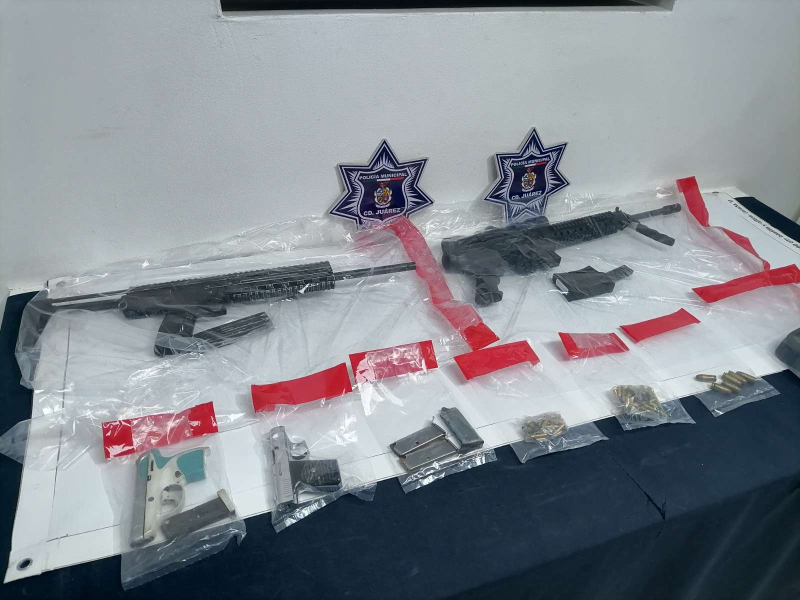 Ciudad Juárez.- Elementos de la Secretaría de Seguridad Pública Municipal adscritos a la Estación de Policía del Distrito Poniente, arrestaron a cinco adultos y un adolescente por su presunta responsabilidad en la comisión de delitos contra la ley federal de armas de fuego y explosivos, tras asegurarles diversas armas de fuego y cartuchos útiles.
