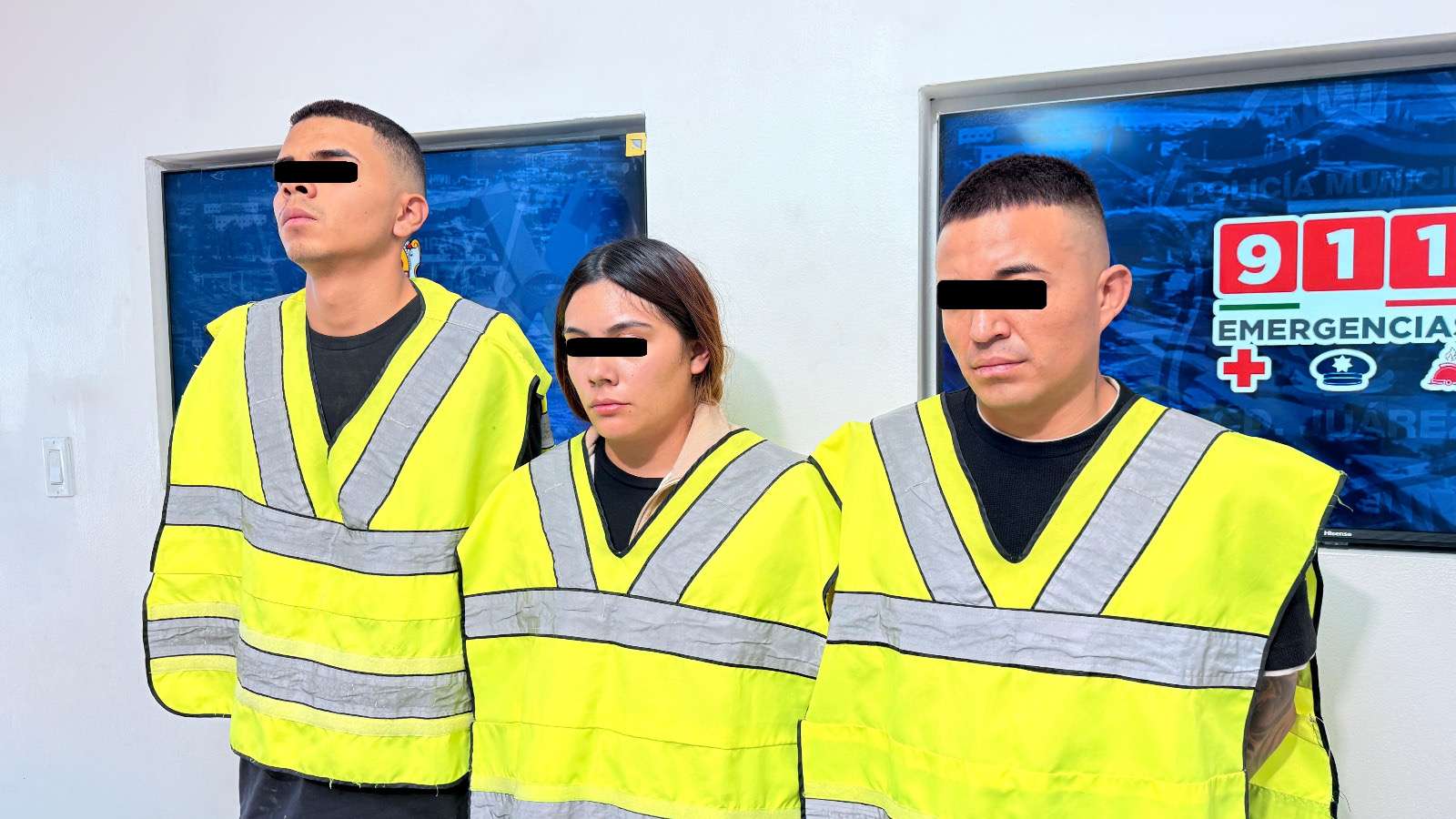Ciudad Juárez.- Elementos de la Secretaría de Seguridad Pública Municipal, adscritos a la Estación de Policía del Distrito Universidad, llevaron a cabo la detención de dos hombres y una mujer identificados como Carlos Alfredo M. G., Juan Josué M. N. y Nubia Adriana G. H., por su presunta responsabilidad en la comisión de delitos contra la salud y violación a la ley federal de armas de fuego y explosivos, así como por su posible relación en un hecho de homicidio.