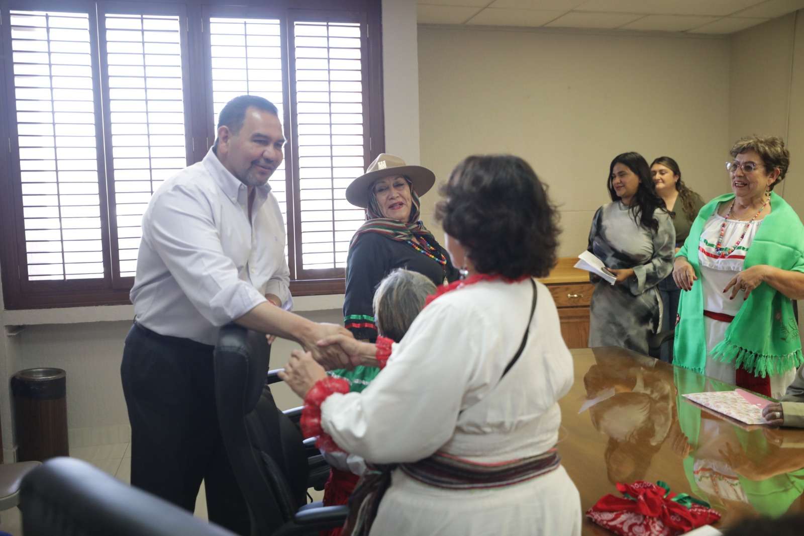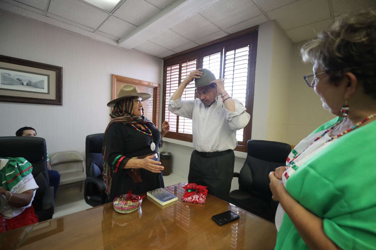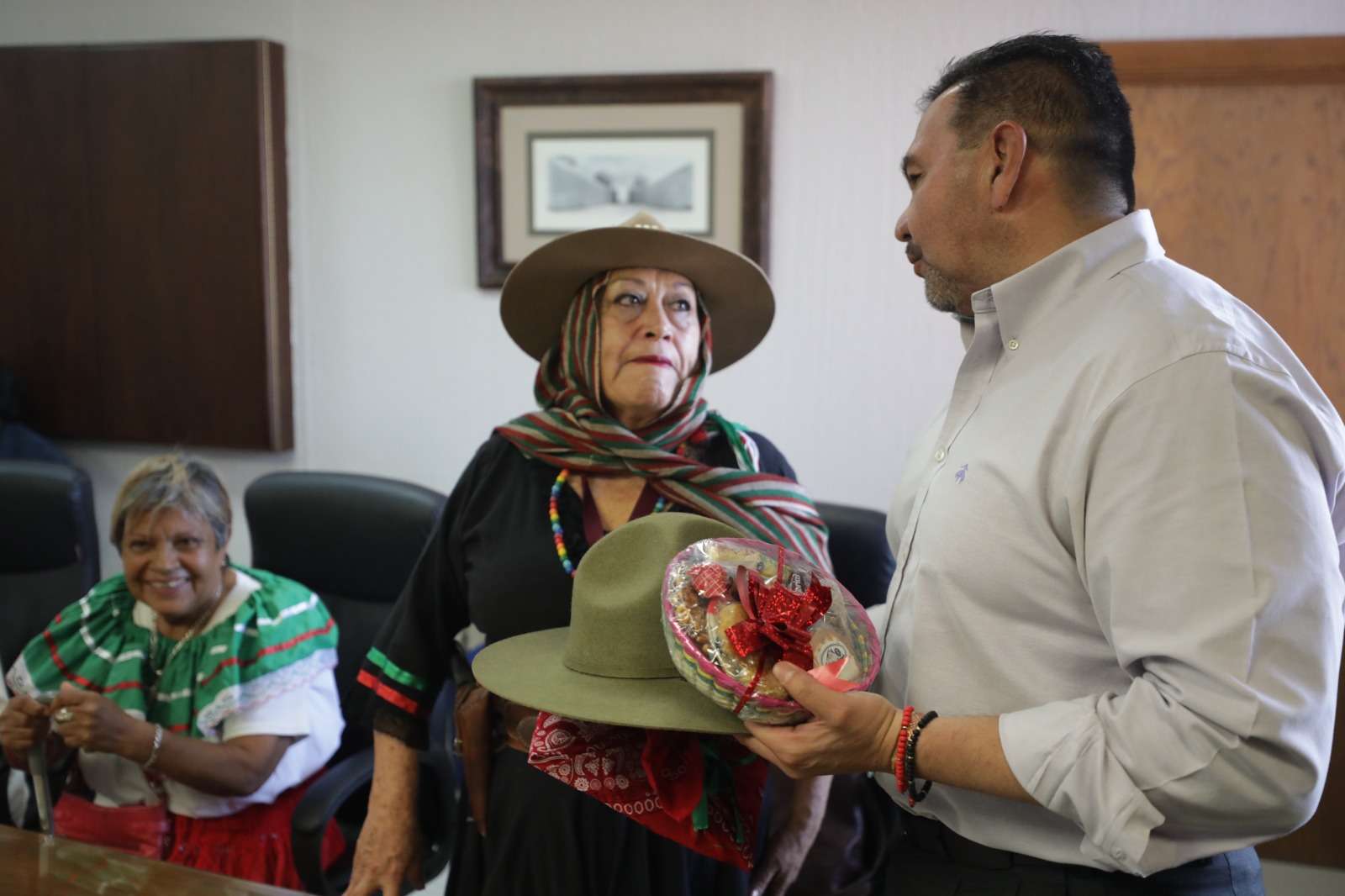 El encuentro se llevó a cabo en el marco de la entrega de un apoyo económico a personas que forman parte de la Asociación Civil Unificación Nacional de Veteranos, Viudas, Hijos y Nietos de la Revolución Mexicana, quienes le regalaron al alcalde un sombrero parecido a los que usaba Francisco Villa.
