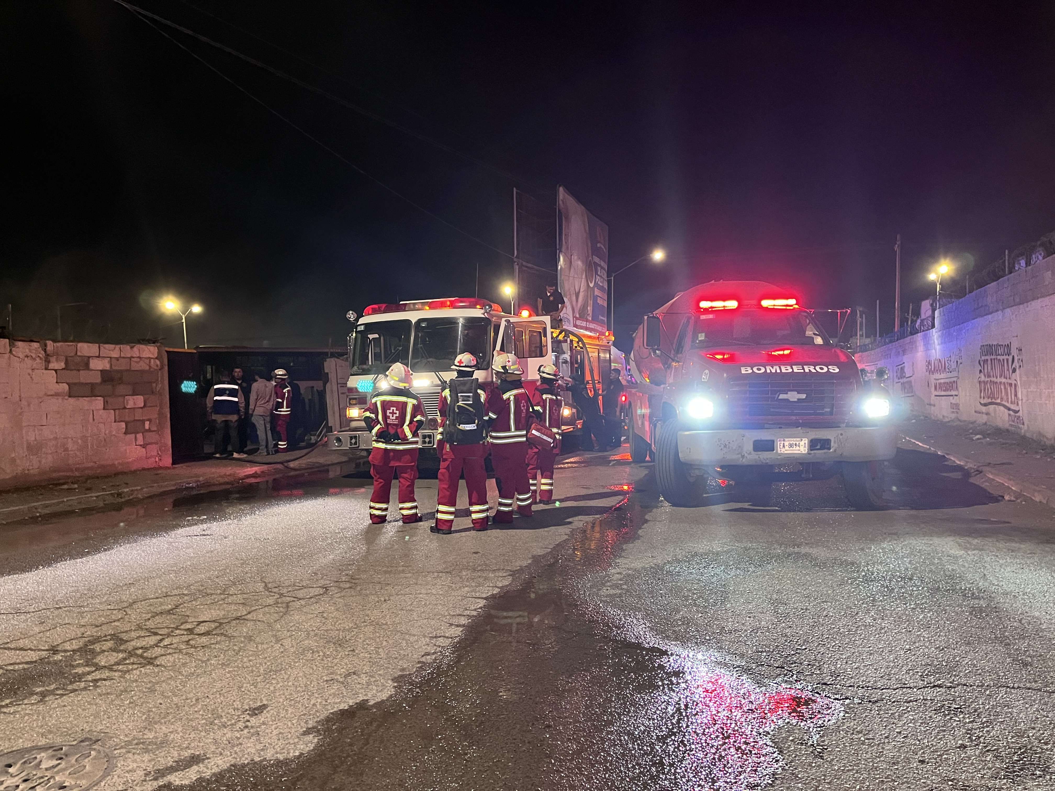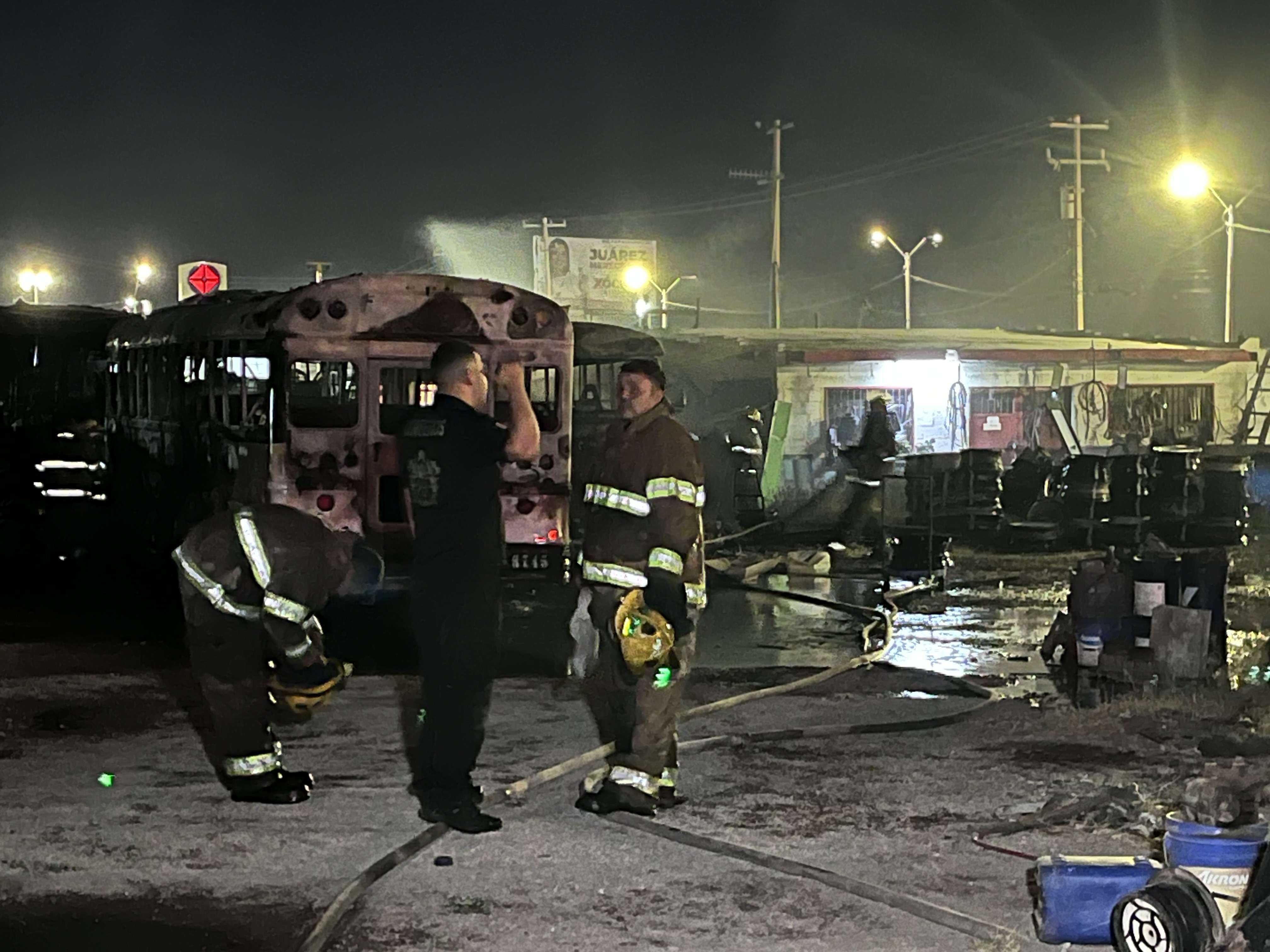 Ciudad Juárez.-Un voraz incendio dejó reducidos a chatarra a por lo menos media docena de camiones de transporte de personal al interior de un taller ubicado en el fraccionamiento educación.