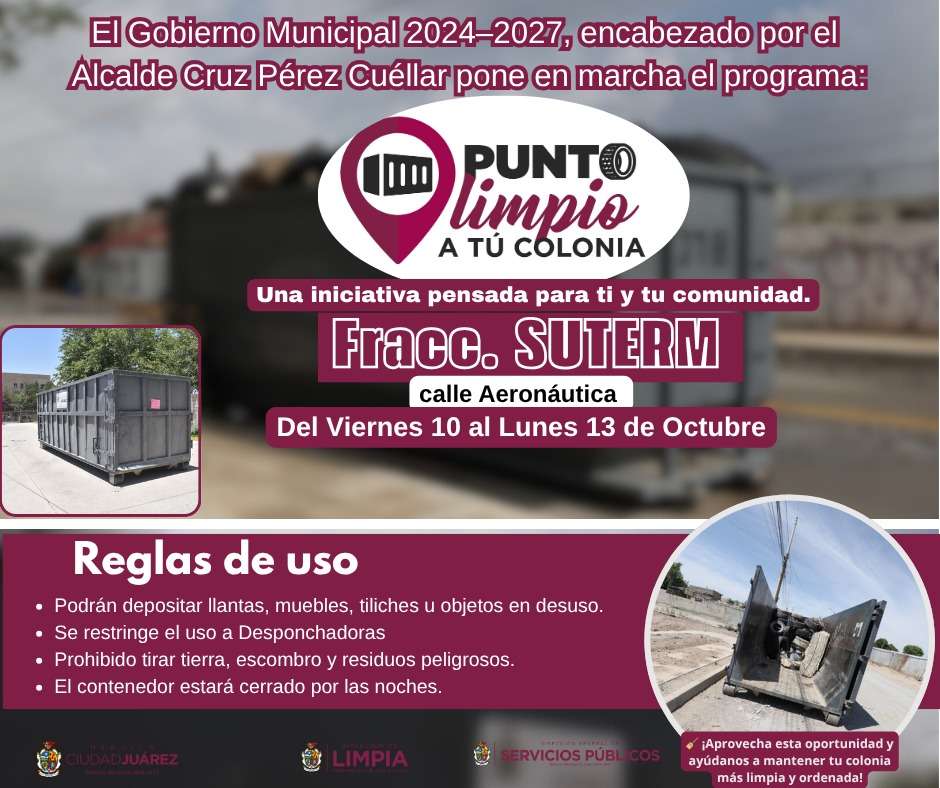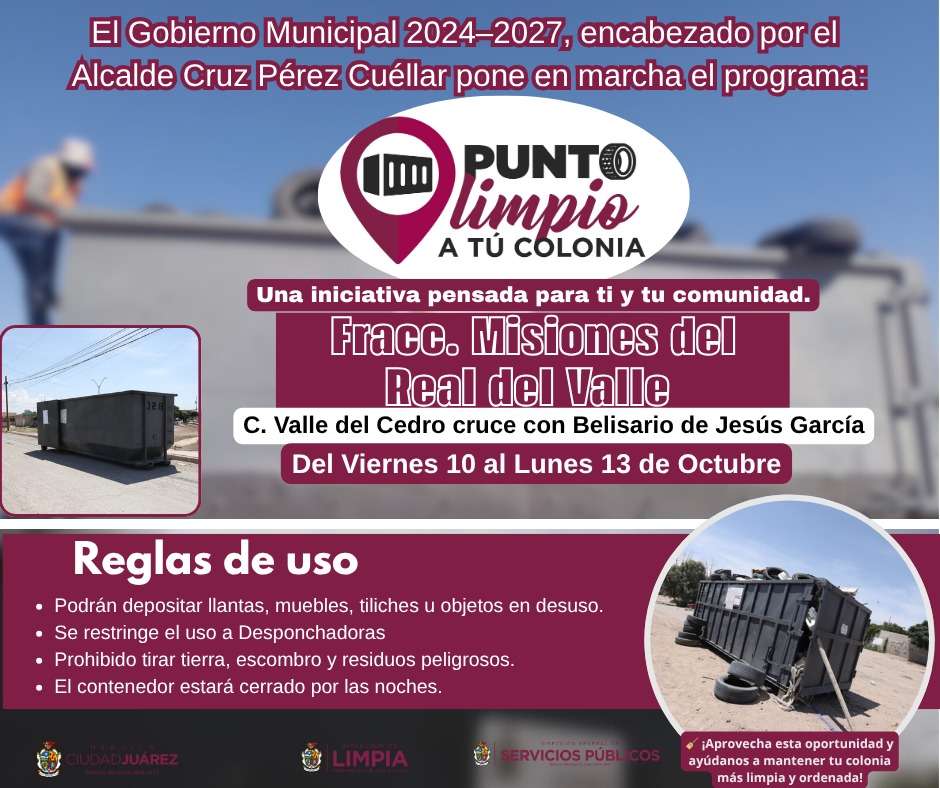 Ciudad Juárez.- La Dirección de Limpia habilitó tres nuevos Puntos Limpios dentro del programa A tu colonia, los cuales estarán disponibles del 10 al lunes 13 de octubre en distintos sectores de la ciudad, informó el titular de la dependencia, Gibran Solís Kanahan.