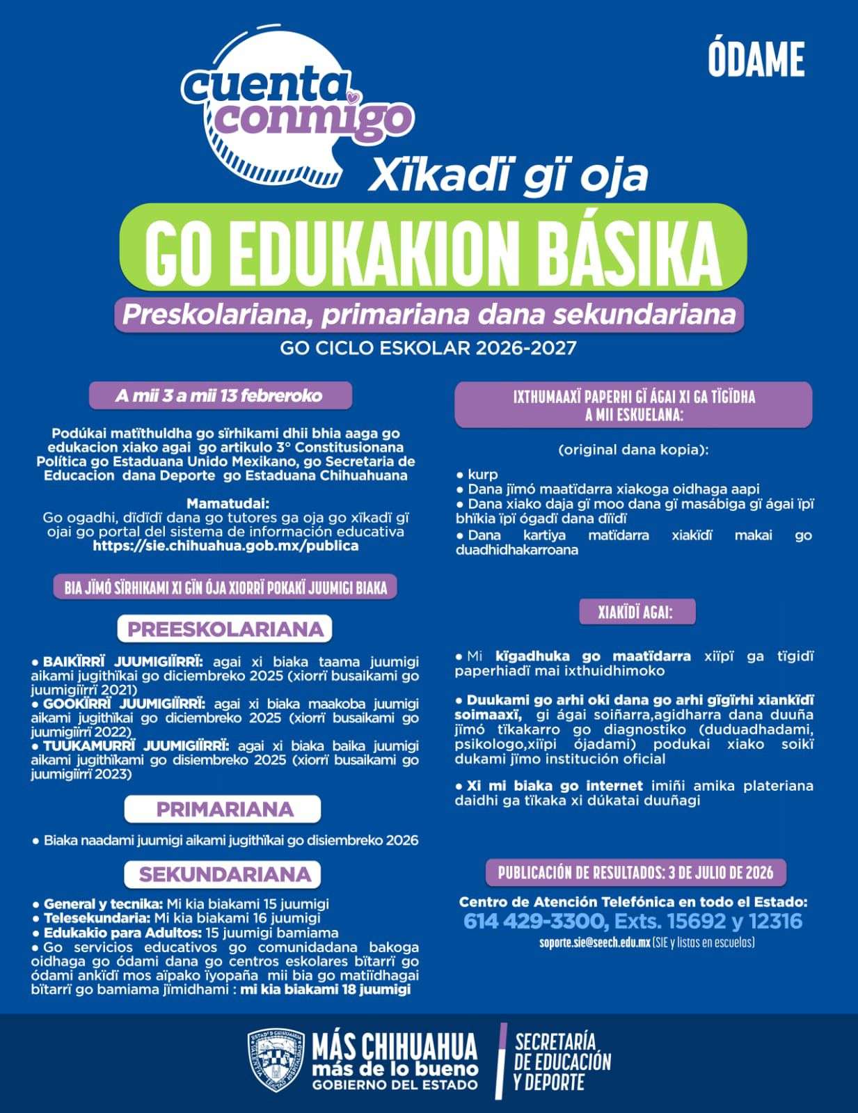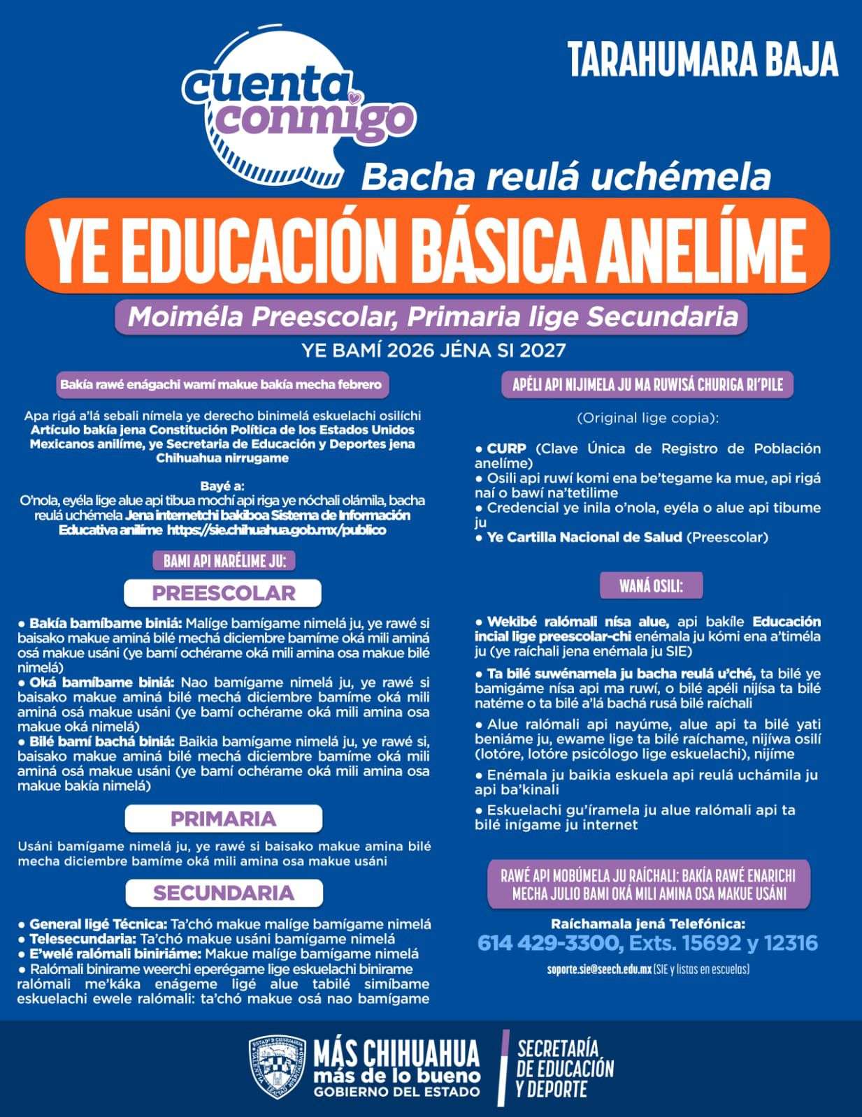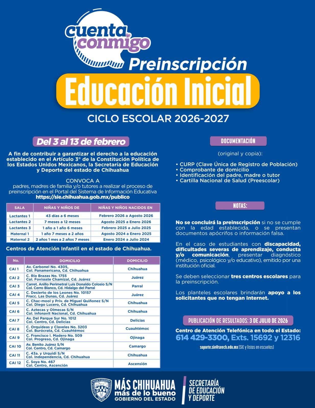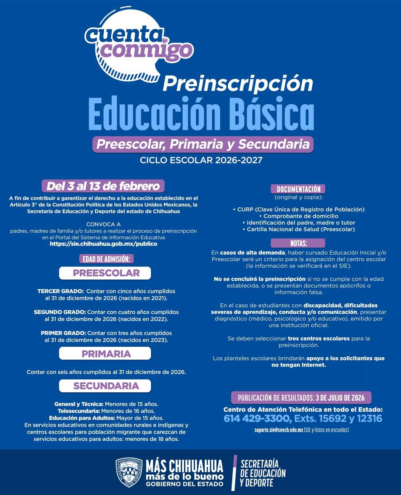 Ciudad Juárez.- La Secretaría de Educación y Deporte (SEyD) informó que del 3 al 13 de febrero, se efectuará el proceso de preinscripción de estudiantes de nuevo ingreso a los niveles Inicial, Preescolar, Primaria y Secundaria, para el ciclo escolar 2026-2027.