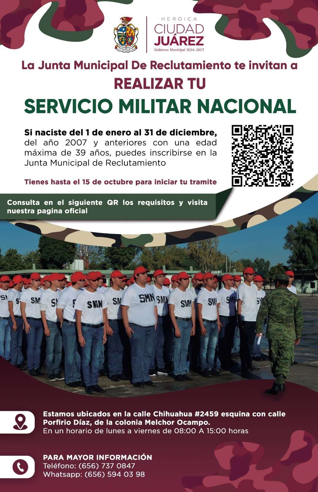 Ciudad Juárez.- La Junta Municipal de Reclutamiento de Ciudad Juárez convoca a los jóvenes a registrarse para cumplir con el Servicio Militar Nacional y obtener su Cartilla Militar. También invitan a las mujeres a sumarse como voluntarias.