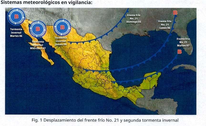 El arribo de dicho sistema frontal está previsto para la noche de este domingo, lo que traerá consigo un marcado descenso de las temperaturas en la región fronteriza, además la masa de aire ártico que le acompaña, generará una onda fría sobre el territorio estatal a partir del lunes.
