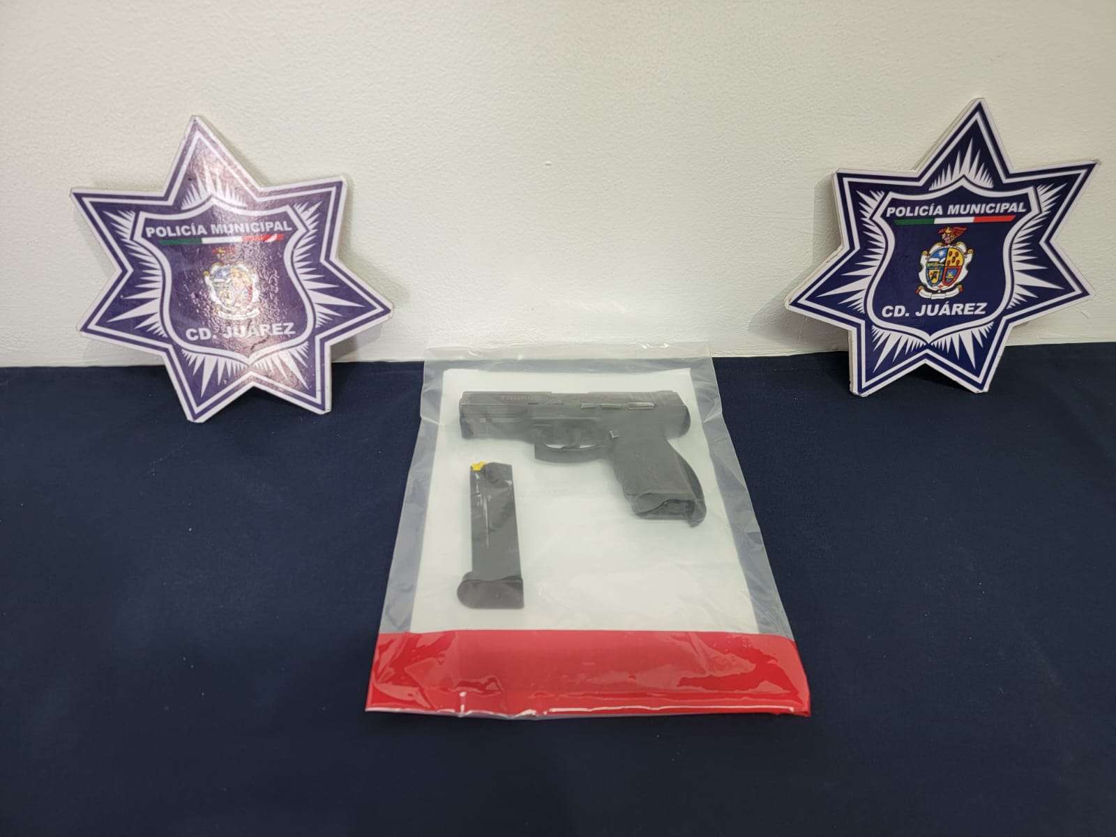 Posteriormente al someterlo a una inspección preventiva le fue localizada un arma de fuego calibre nueve milímetros con un cargador desabastecido, razón por la cual fue puesto bajo detención por delitos contra la ley federal de armas de fuego y explosivos.