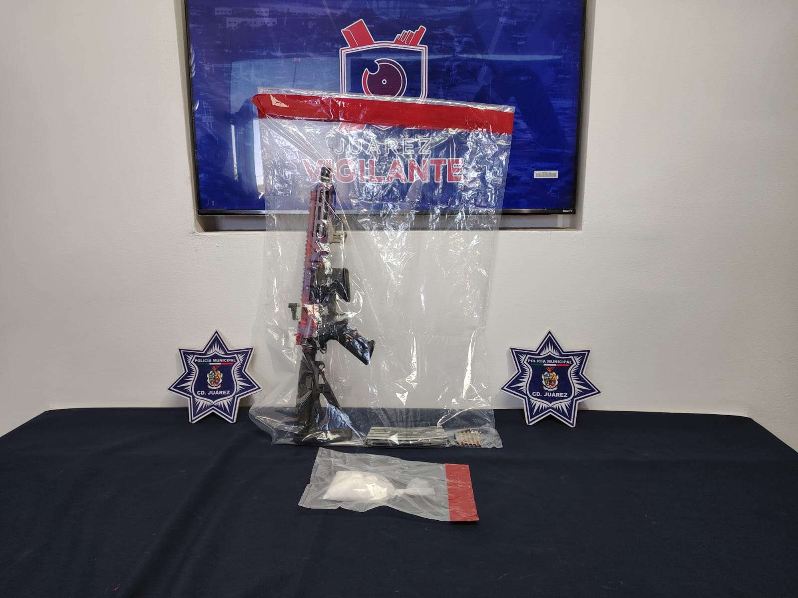 Ciudad Juárez.- Agentes de la Secretaría de Seguridad Pública Municipal arrestaron a Roberto F. O., por su presunta responsabilidad en la comisión de delitos contra la salud y violación a la ley federal de armas de fuego y explosivos.