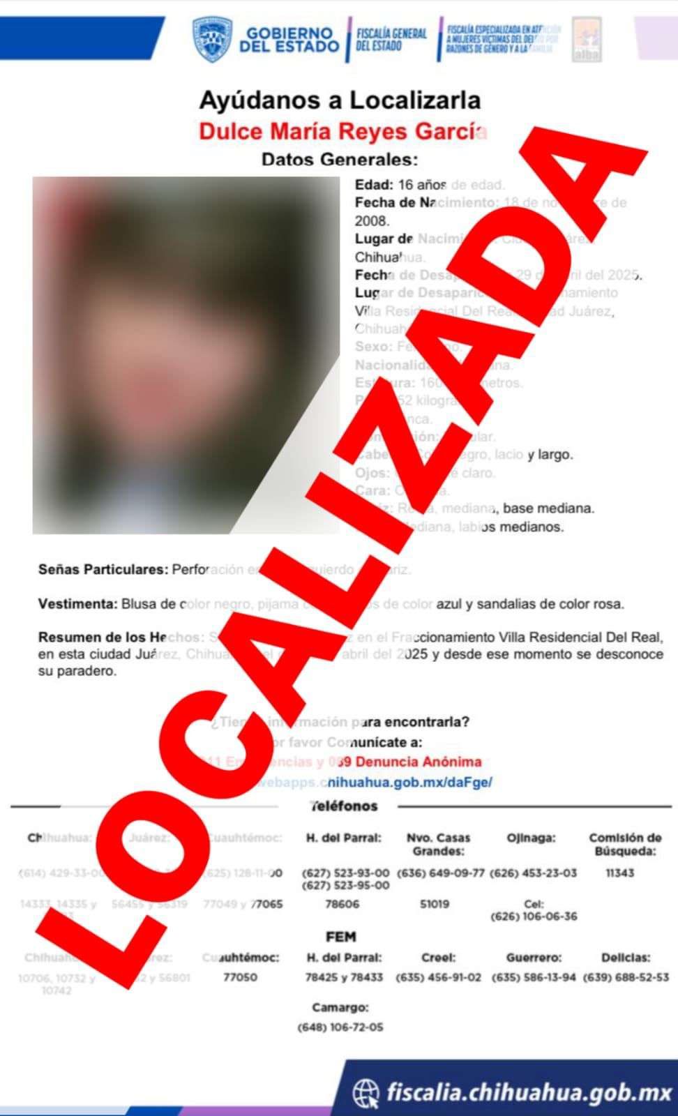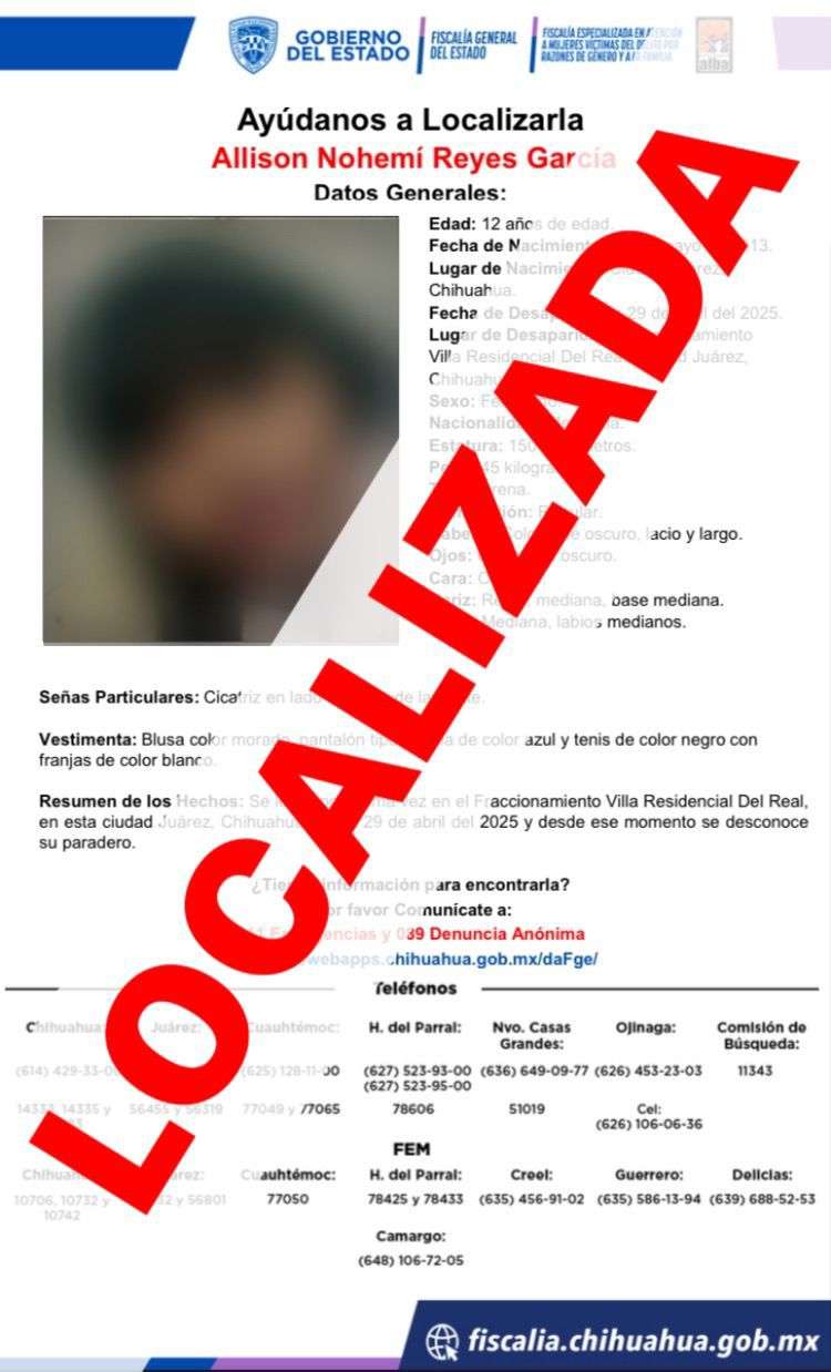 Ciudad Juárez.- Elementos de la Fiscalía Especializada en Atención a Mujeres Víctimas del Delito por Razones de Género y a la Familia (FEM) de la Zona Norte, localizaron sanas y salvas a dos menores de edad de iniciales A.N.R.G., y D.M.R.G., quienes habían desaparecido desde el 29 de abril de 2025, en Ciudad Juárez.