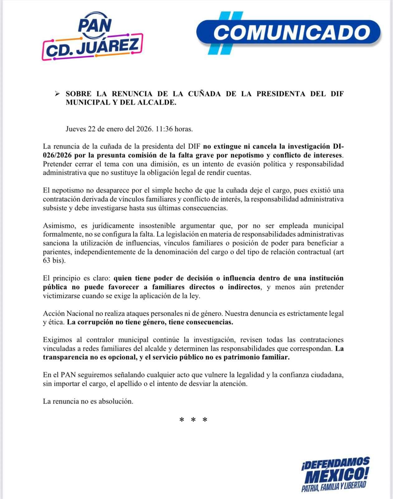Ciudad Juárez.– El Partido Acción Nacional (PAN) en Ciudad Juárez informó que la denuncia por nepotismo y conflicto de intereses relacionada con el Sistema para el Desarrollo Integral de la Familia (DIF) municipal continuará hasta sus últimas consecuencias, pese a la renuncia de la cuñada de la presidenta del organismo y del alcalde.