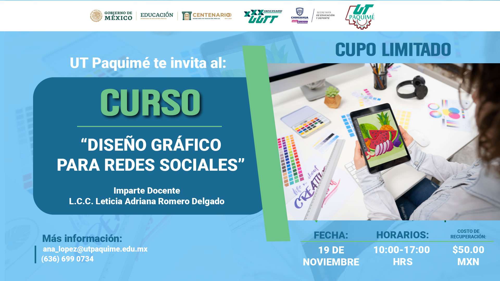 En lo que respecta a la carrera de Desarrollo de Negocios área Mercadotecnia, la docente Leticia Romero ofrecerá el curso “Diseño gráfico para redes sociales”, el día 19 de noviembre en un horario de 10:00 a 17:00 horas.
