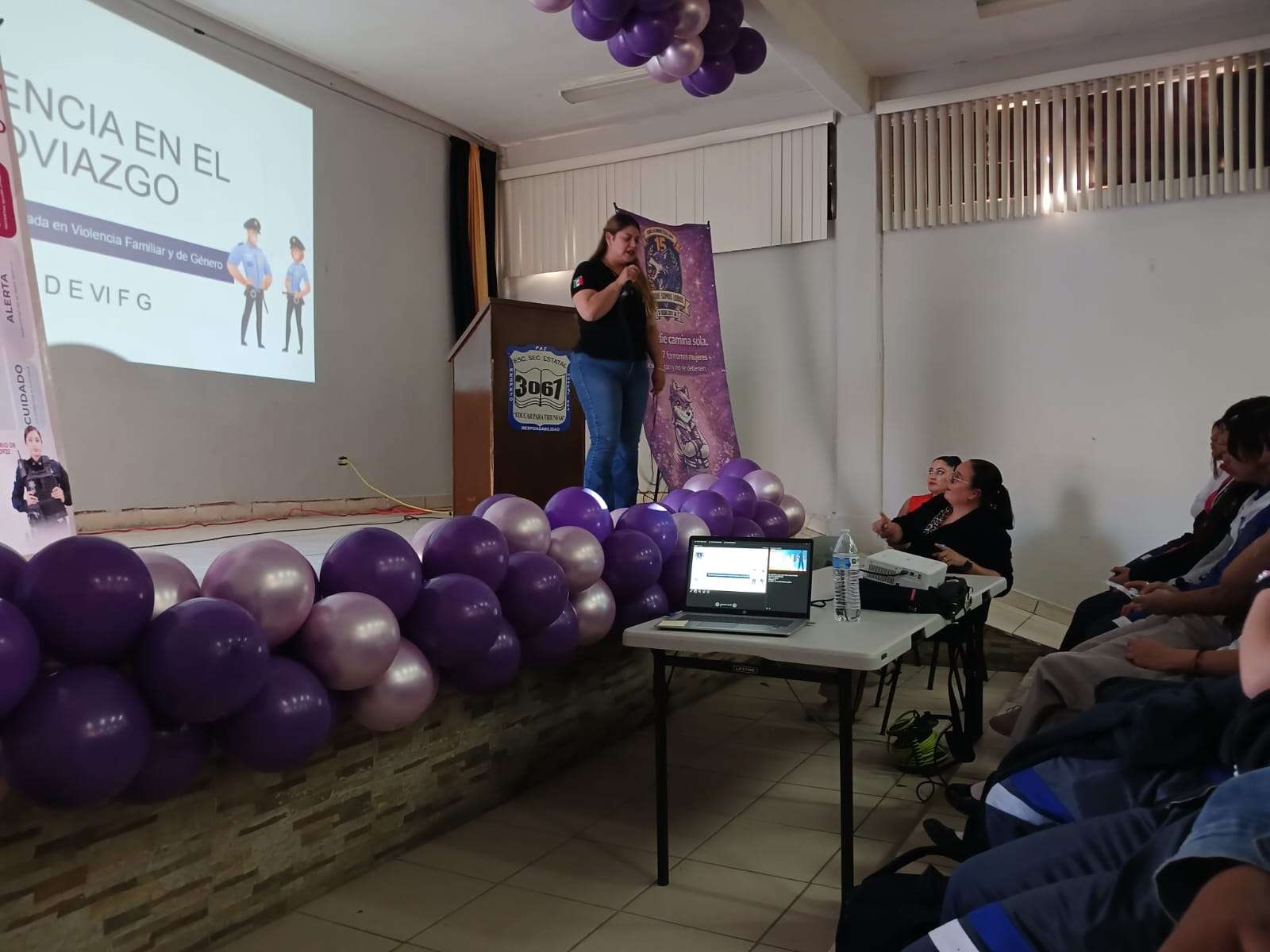 Ciudad Juárez.- Elementos de la Secretaría de Seguridad Pública Municipal, adscritos a la Dirección Especializada en Violencia Familiar y de Género (DEVIFG), llevó a cabo la impartición de pláticas preventivas con el tema “Violencia en el noviazgo” a estudiantes de la escuela secundaria Estatal 3067.