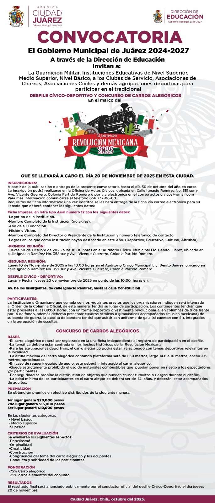 Ciudad Juárez.- La Dirección de Educación Municipal invita a instituciones educativas de nivel básico, medio superior y superior, así como a clubes de servicio, asociaciones civiles, agrupaciones deportivas y la Guarnición Militar, a participar en el tradicional Desfile Cívico-Deportivo y Concurso de Carros Alegóricos con motivo del 115 aniversario de la Revolución Mexicana.