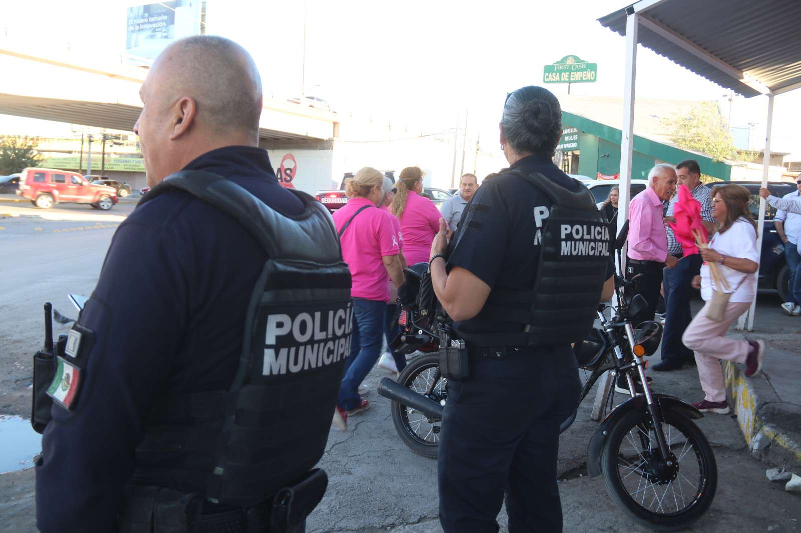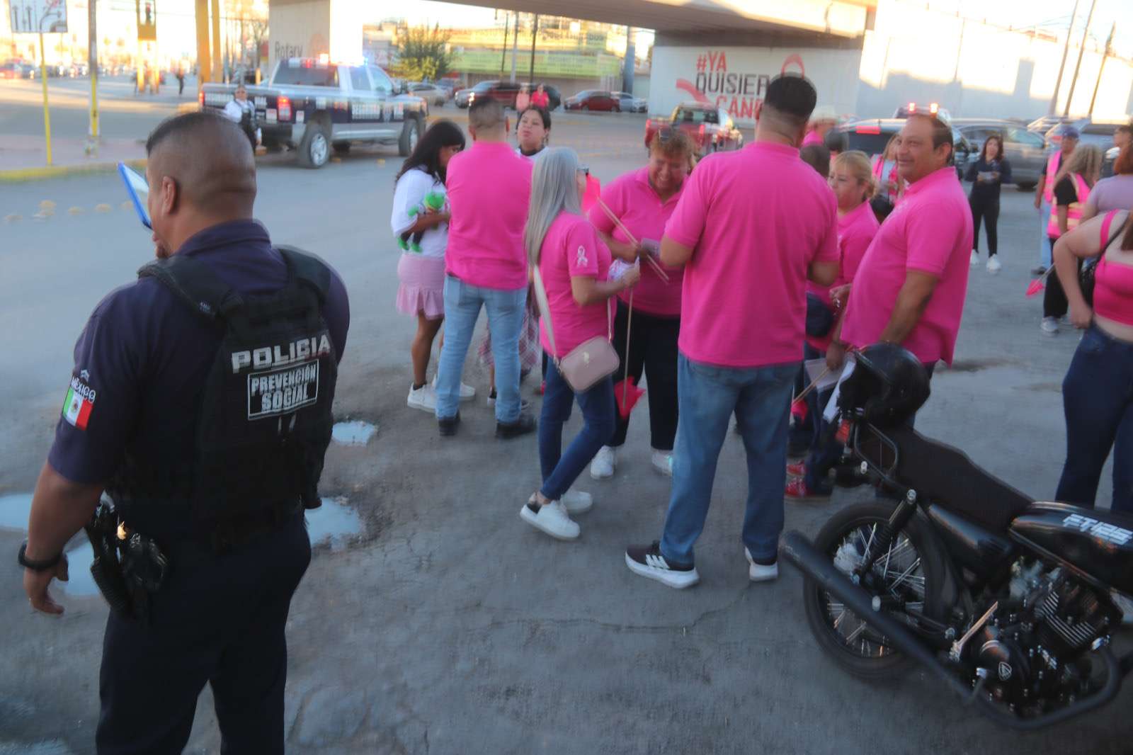 Ciudad Juárez.- En el marco de las actividades conmemorativas del mes de octubre, dedicado a la lucha contra el cáncer y su detección temprana, elementos de la Secretaría de Seguridad Pública Municipal participaron en una jornada de entrega de volantes informativos a la ciudadanía.