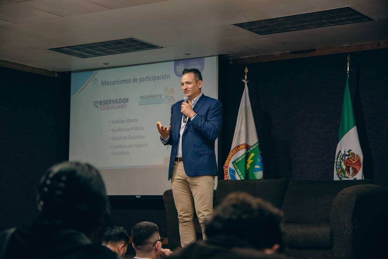 Ciudad Juárez.- A invitación de la Facultad de Ciencias Políticas y Sociales de la Universidad Autónoma de Chihuahua (UACH) campus Juárez al evento Foro de Alcaldes, el presidente municipal de Chihuahua Marco Bonilla, expuso las acciones que desde su administración ha implementado para eficientar el recurso público, además aprovechó el espacio para exhortar a las y los jóvenes a involucrarse en la vida pública de su municipio e informarse de las acciones que realizan las administraciones públicas.