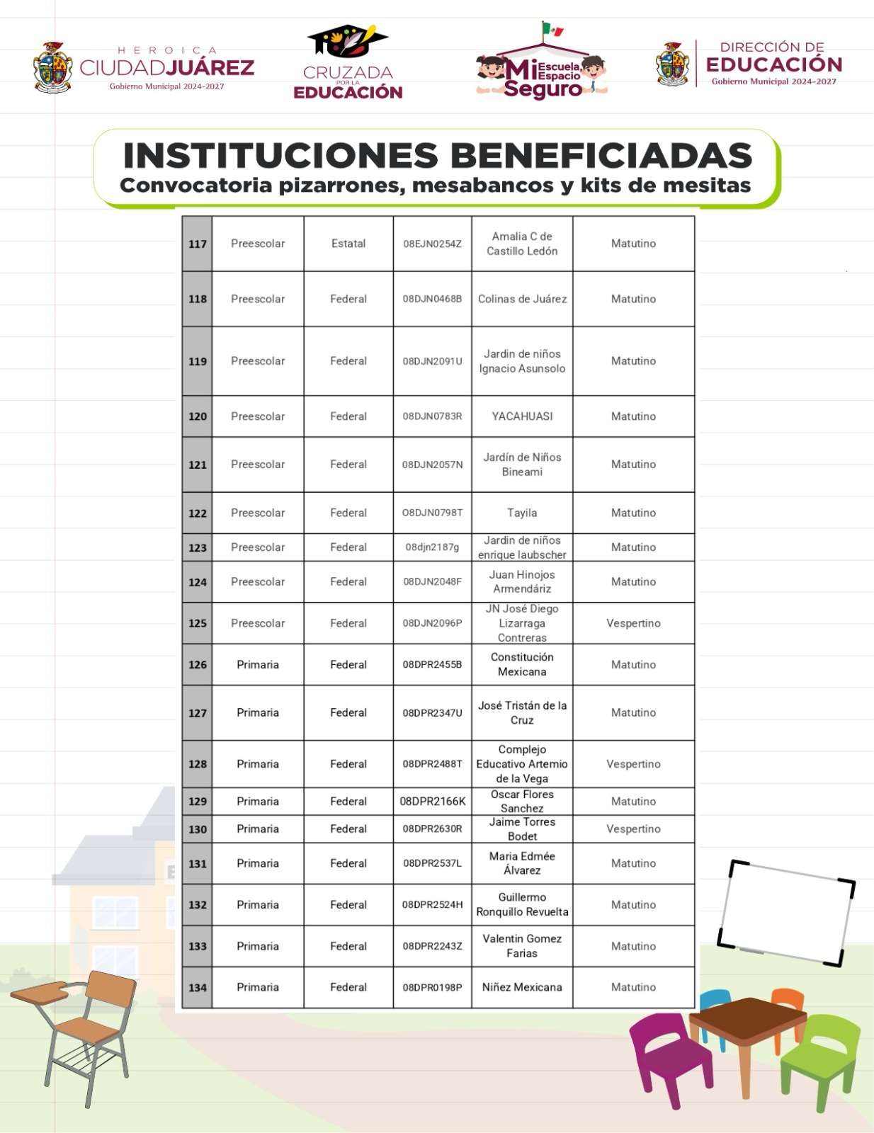Los planteles públicos beneficiados corresponden a los niveles de preescolar, primaria, secundaria y Centros de Atención Múltiple y pueden ser consultados ingresando a www.facebook.com/EducacionCdJuarez