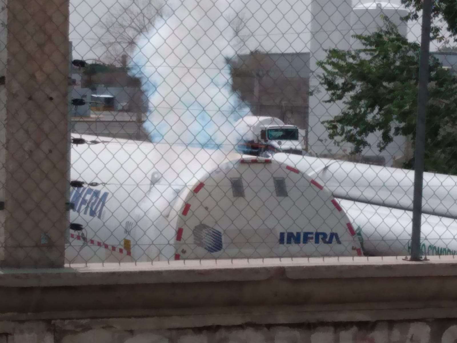 Juárez.- Una pipa que transporta gas de nitrógeno provocó pánico entre los residentes de que habitan en los en las inmediaciones del Eje Vial y calle El vergel, luego de que este empezará a sacar una especie de gas por la parte trasera.