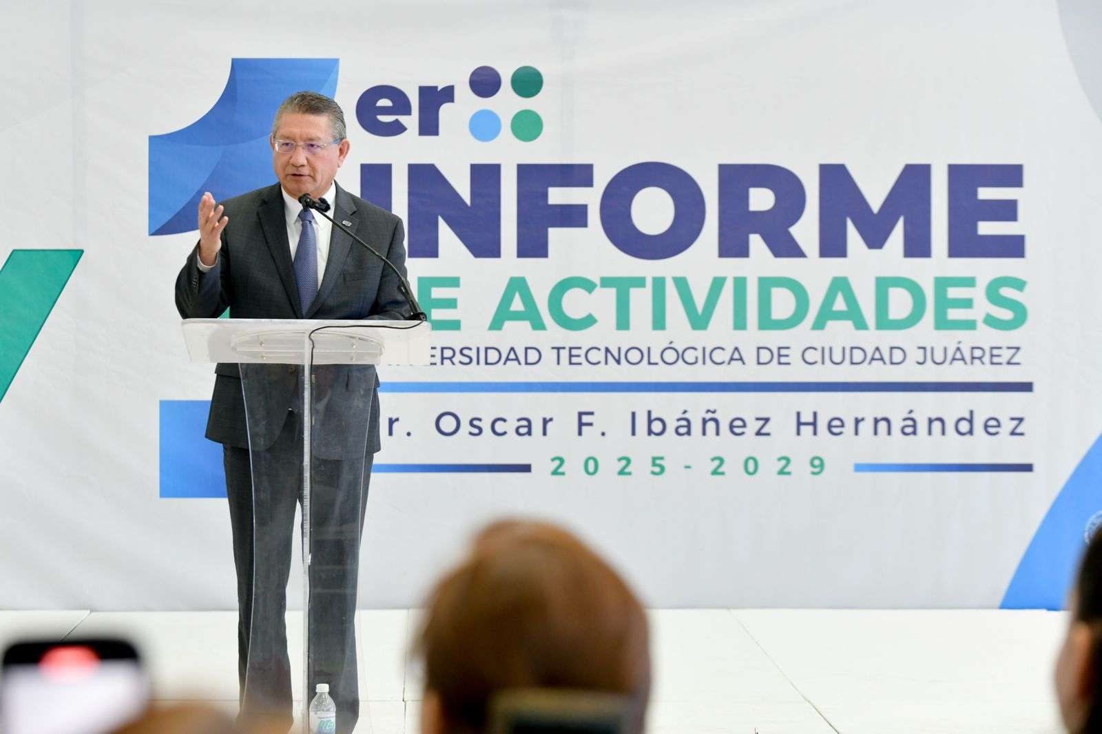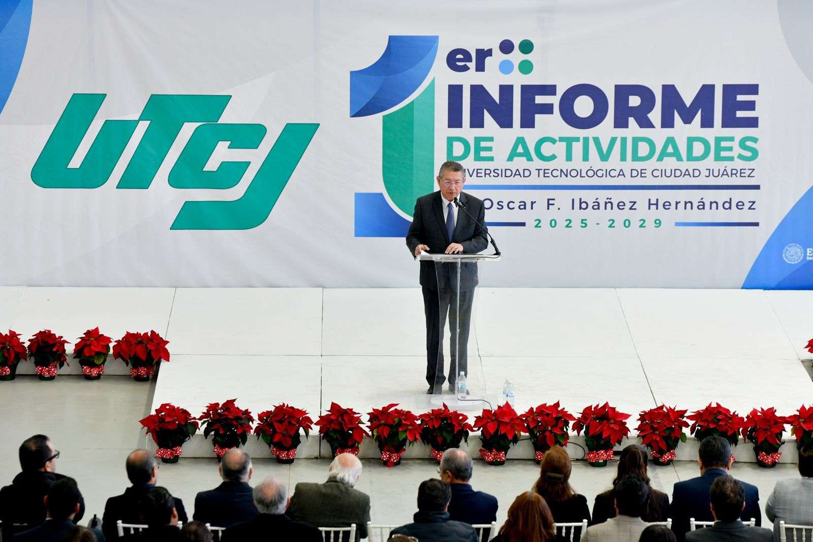 Ciudad Juárez.– En el gimnasio de la Universidad Tecnológica de Ciudad Juárez (UTCJ), el rector Óscar Ibáñez Hernández presentó su Primer Informe de Actividades, en el que dio cuenta de los principales avances académicos, administrativos y de infraestructura alcanzados durante el año, así como de los logros obtenidos por la comunidad universitaria.