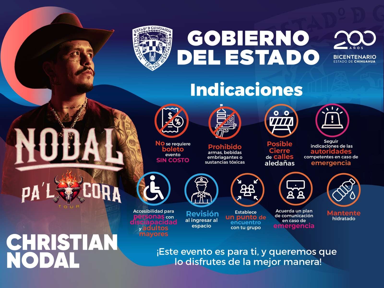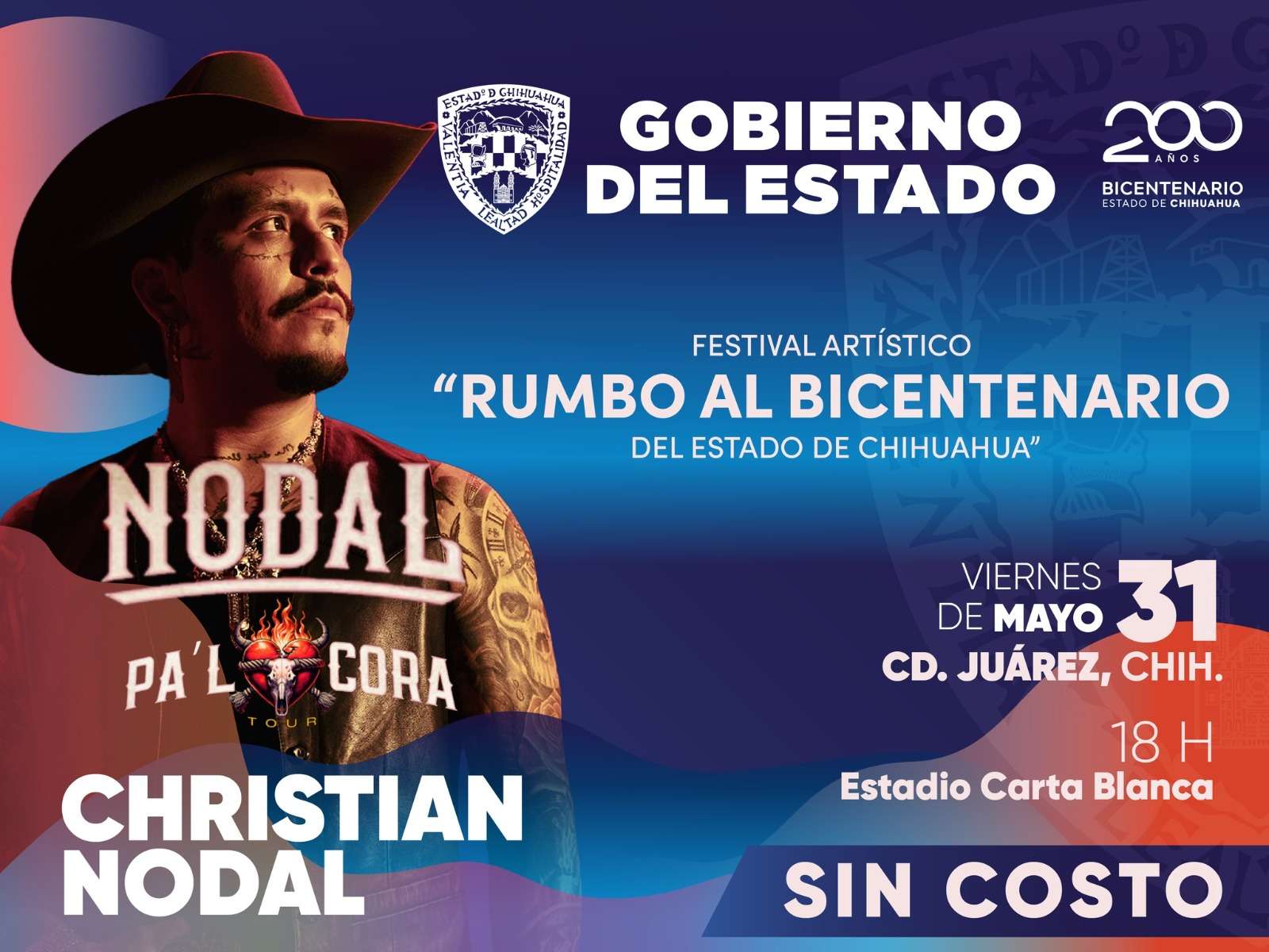 Ciudad Juárez.- Como parte de las actividades del Festival Artístico “Rumbo al Bicentenario del Estado de Chihuahua”, la Secretaría de Cultura invita al concierto a cargo del artista Christian Nodal, quien se presentará este viernes 31 de mayo en el Estadio Carta Blanca de Ciudad Juárez, a partir de las 18:00 horas, con entrada libre.