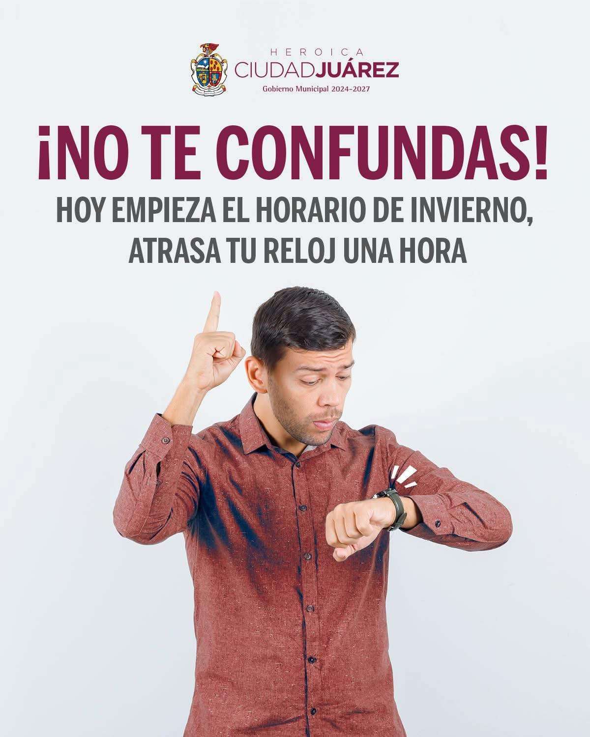 El Gobierno Municipal de Ciudad Juárez emitió un recordatorio a la población con el mensaje “¡No te confundas! Hoy empieza el horario de invierno, atrasa tu reloj una hora”, para evitar contratiempos en las actividades cotidianas como el trabajo, la escuela o el transporte público.