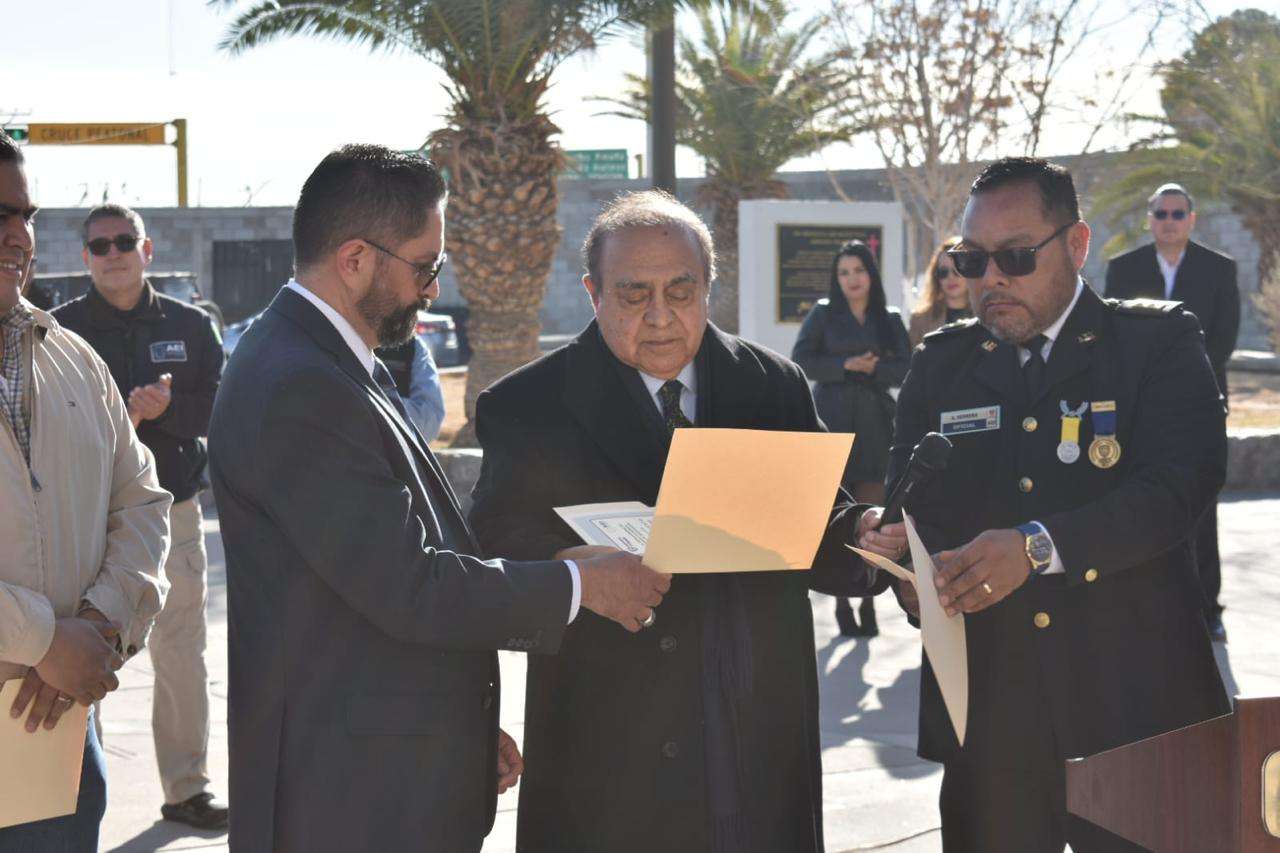 Previo a concluir la ceremonia, el Fiscal de Distrito, Carlos Manuel Salas, en compañía del Coordinador Regional de la AEI, Hermann Pérez Rico, entregaron un reconocimiento especial a César Tapia Martínez, director de Seguridad Vial, por la participación de los elementos en el acto protocolario.