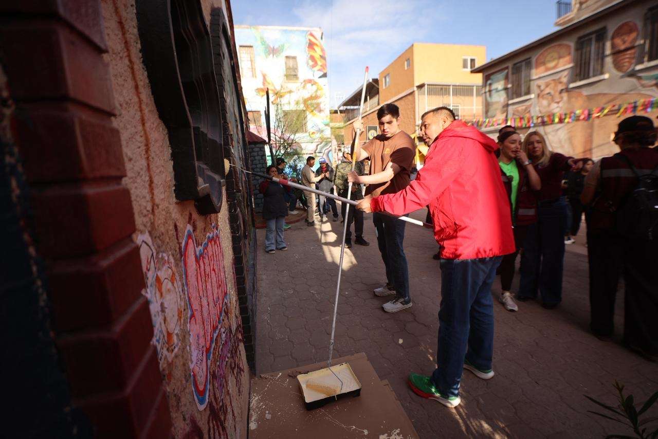 Ciudad Juárez.- Como parte de las acciones para fortalecer el tejido social y mejorar el entorno urbano, el Gobierno Municipal de Ciudad Juárez, encabezado por el Presidente Municipal, Cruz Pérez Cuéllar, llevó a cabo una jornada del programa “Juárez Amanece Limpio” en la Plaza Cervantina, con la participación de ciudadanía, colectivos culturales y el FC Juárez.