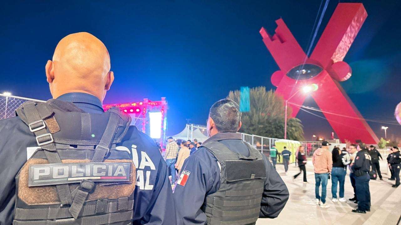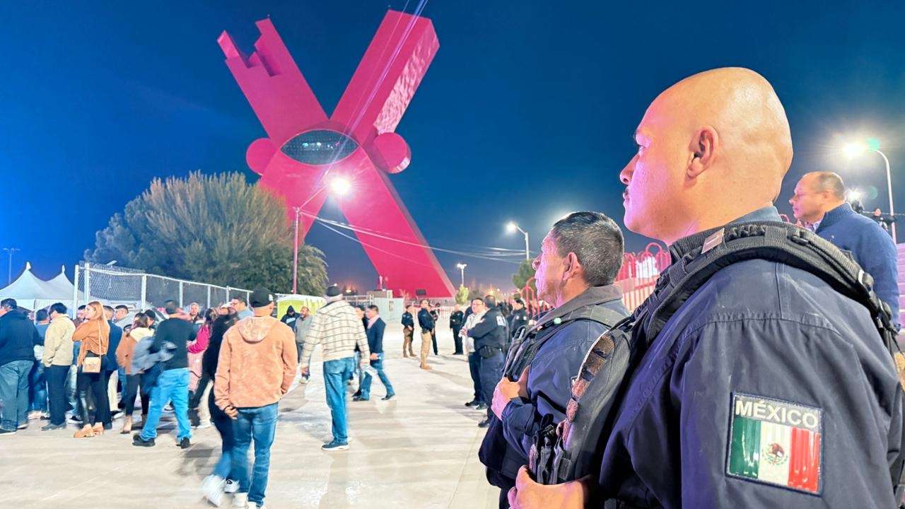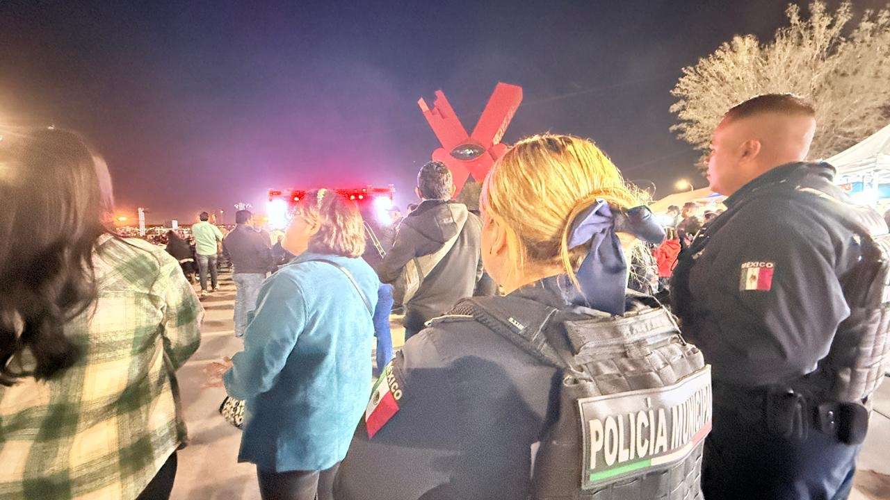 De acuerdo con imágenes compartidas por asistentes y autoridades, se observó la presencia de elementos de Seguridad Pública Municipal ubicados estratégicamente en los accesos principales, perímetro del escenario y áreas de mayor concentración de personas.